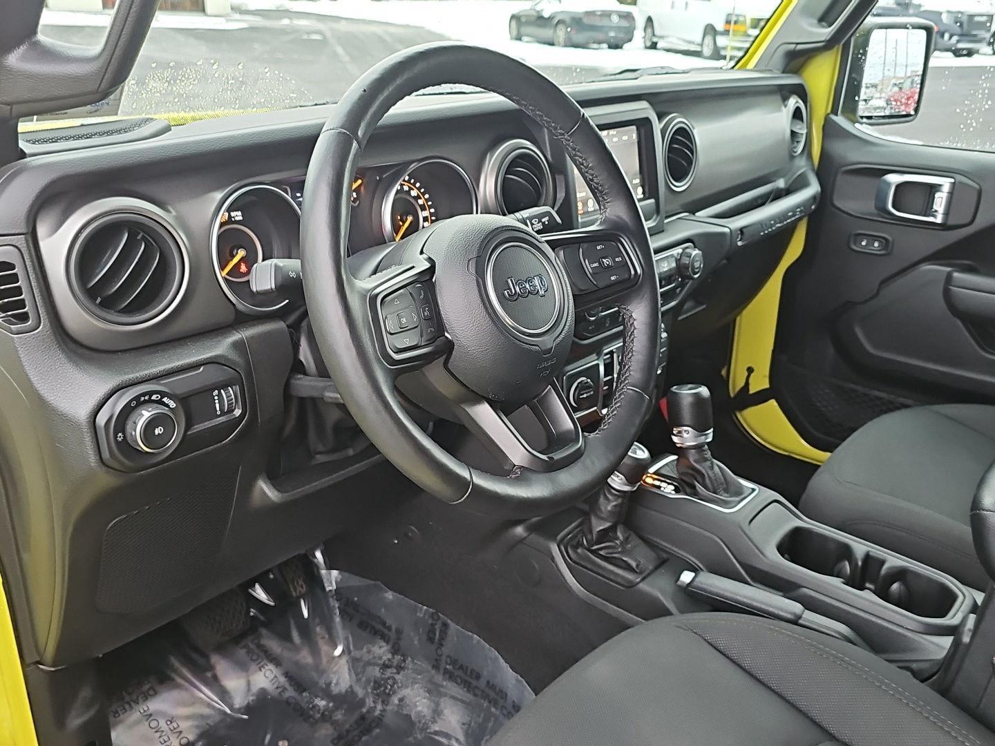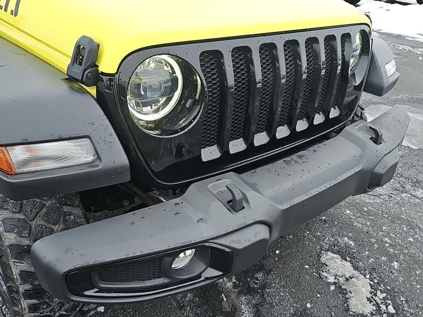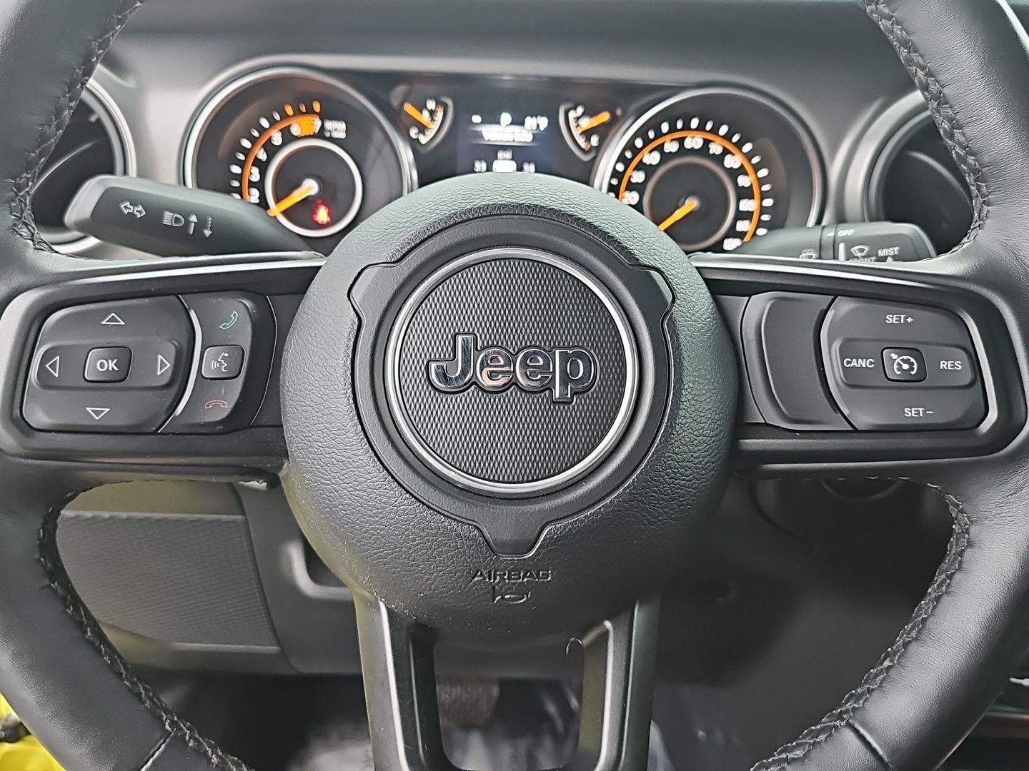 Stand out in this 2023 Jeep Wrangler Willys — striking Yellow exterior with a Black leather interior. Ready for adventure, it delivers true off‑road performance with 4WD, locking/limited‑slip differentials, 10" ground clearance and beefy 255/70R18 tires, while safety systems like ABS, traction and stability control and a full suite of airbags keep you protected. Enjoy everyday comfort and convenience with heated leather seats and steering wheel, multi‑adjustable power seats, keyless entry with remote start/climate control, premium audio with subwoofer, automatic headlights and a full‑size spare. Backed by a 36‑month/36,000‑mile basic warranty, 60‑month/60,000‑mile powertrain warranty and 60‑month rust coverage — come test drive it today.