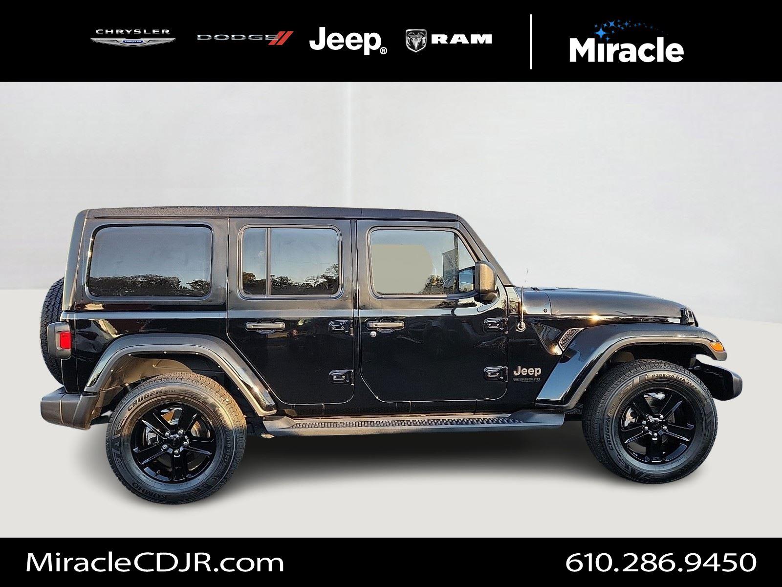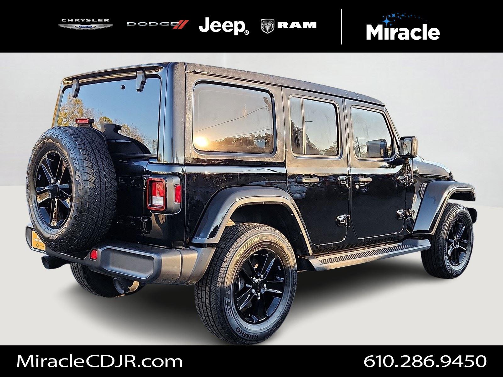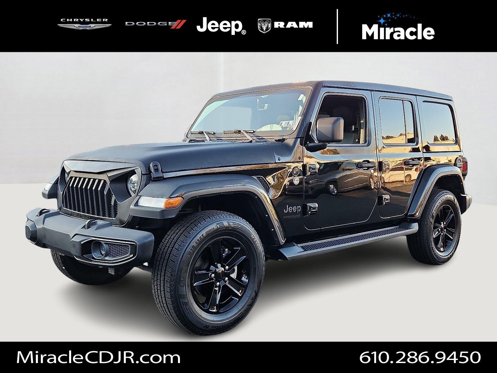 Turn heads in this 2022 Jeep Wrangler Unlimited Sahara Altitude — striking Black exterior with a Black interior and leather-wrapped, heated steering wheel. Built for adventure: true 4WD, 10" ground clearance, 255/70R18 alloy wheels and a full‑size spare, plus ABS, traction control, limited‑slip differential and vehicle stability for confident handling. Comfort and convenience include heated front seats, dual-zone climate with remote start, keyless entry/start, power windows and heated mirrors. Premium touches like navigation, a subwoofer, fog lamps and automatic headlights — all backed by a 3‑year/36K basic and 5‑year/60K powertrain warranty. Ready for a test drive?
