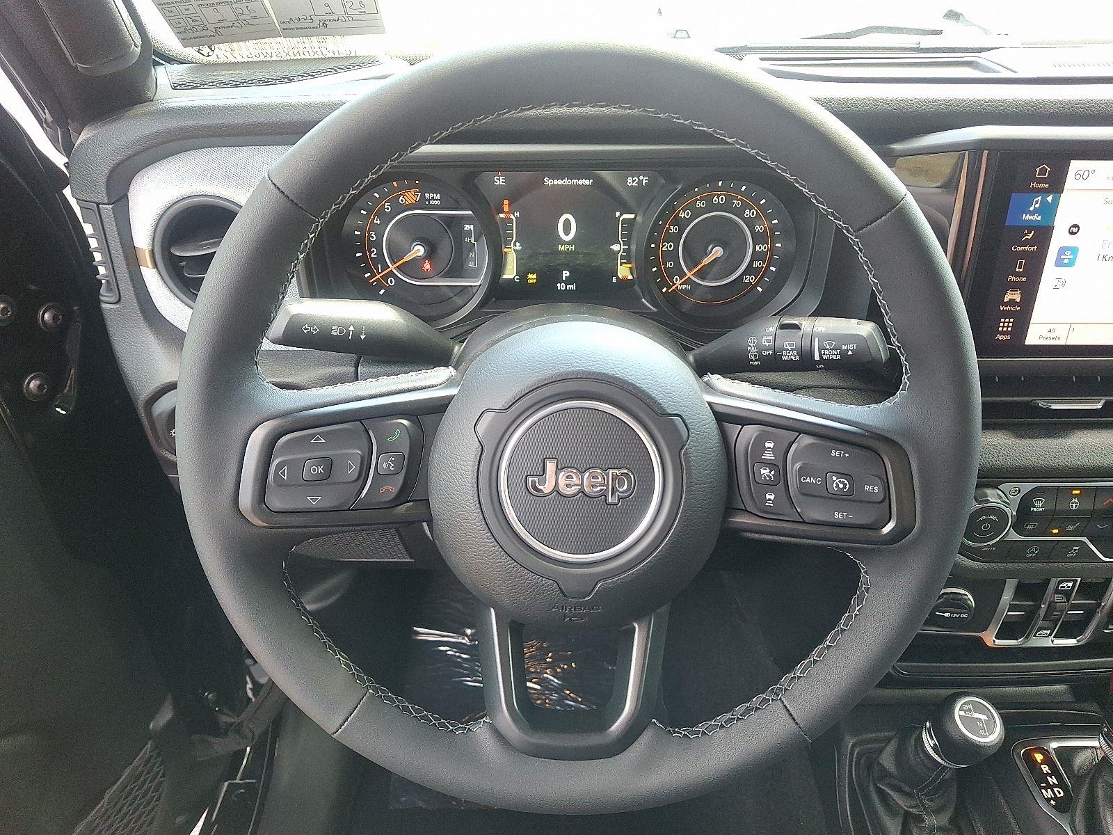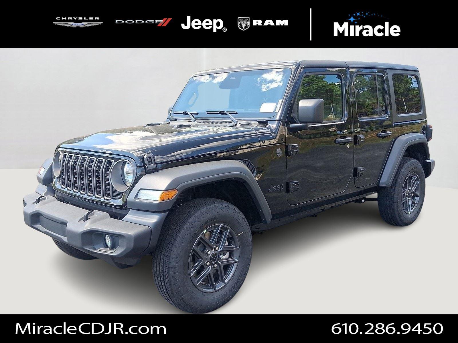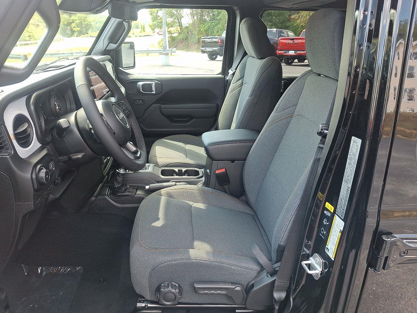 Black-on-black 2025 Jeep Wrangler Sport S — rugged style meets everyday comfort. This Wrangler comes standard with full-time 4WD, 245/75R17 all-terrain tires and 9.7" ground clearance for confident off‑road capability, plus a full‑size spare. Stay comfortable and ready with remote ignition and climate control, separate driver/front-passenger settings, automatic headlights and heated exterior mirrors. Safety is robust with ABS, traction control, vehicle stability control and a full suite of airbags — and the driver enjoys a multi‑adjustable power seat, steering‑wheel controls and tire‑pressure monitoring. Backed by a 36‑month/36,000‑mile basic warranty and a 60‑month/60,000‑mile powertrain warranty. Ready to take it for a spin? Come see it today.