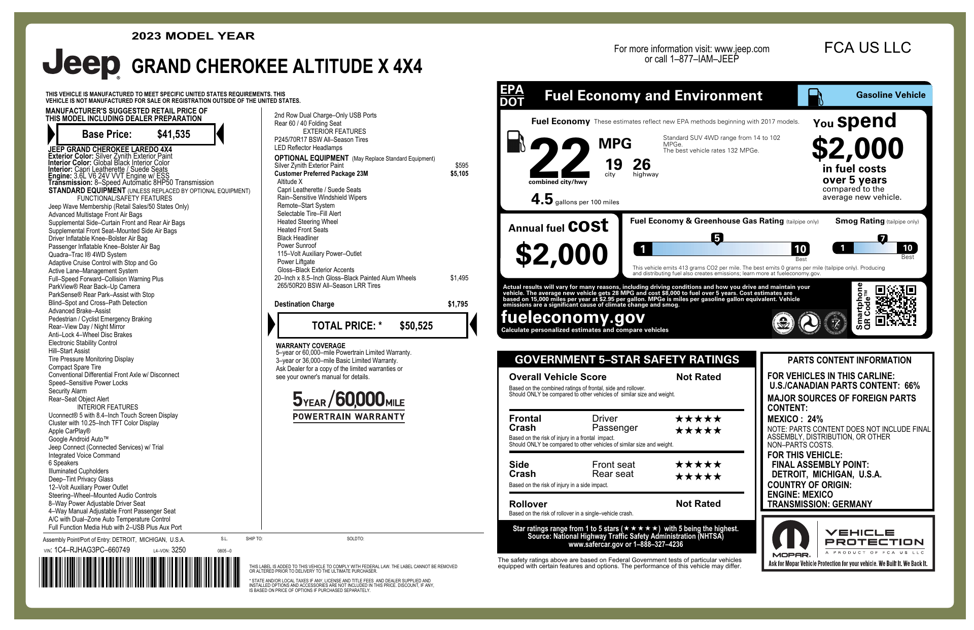 Introducing the 2023 Jeep Grand Cherokee Altitude in striking Silver with a Black leather interior — rugged capability meets refined comfort. With standard 4WD, ABS, electronic brake assist, traction and stability control plus limited‑slip/locking differentials, this SUV inspires confidence in any road or weather. Enjoy heated leather seats, a heated steering wheel, power multi‑adjustable seats with lumbar, dual‑zone climate control with remote ignition, keyless entry/start, AM/FM with subwoofer, automatic headlights and a full suite of airbags for peace of mind. Backed by a 3‑year/36,000‑mile basic and 5‑year/60,000‑mile powertrain warranty — come take it for a test drive today.