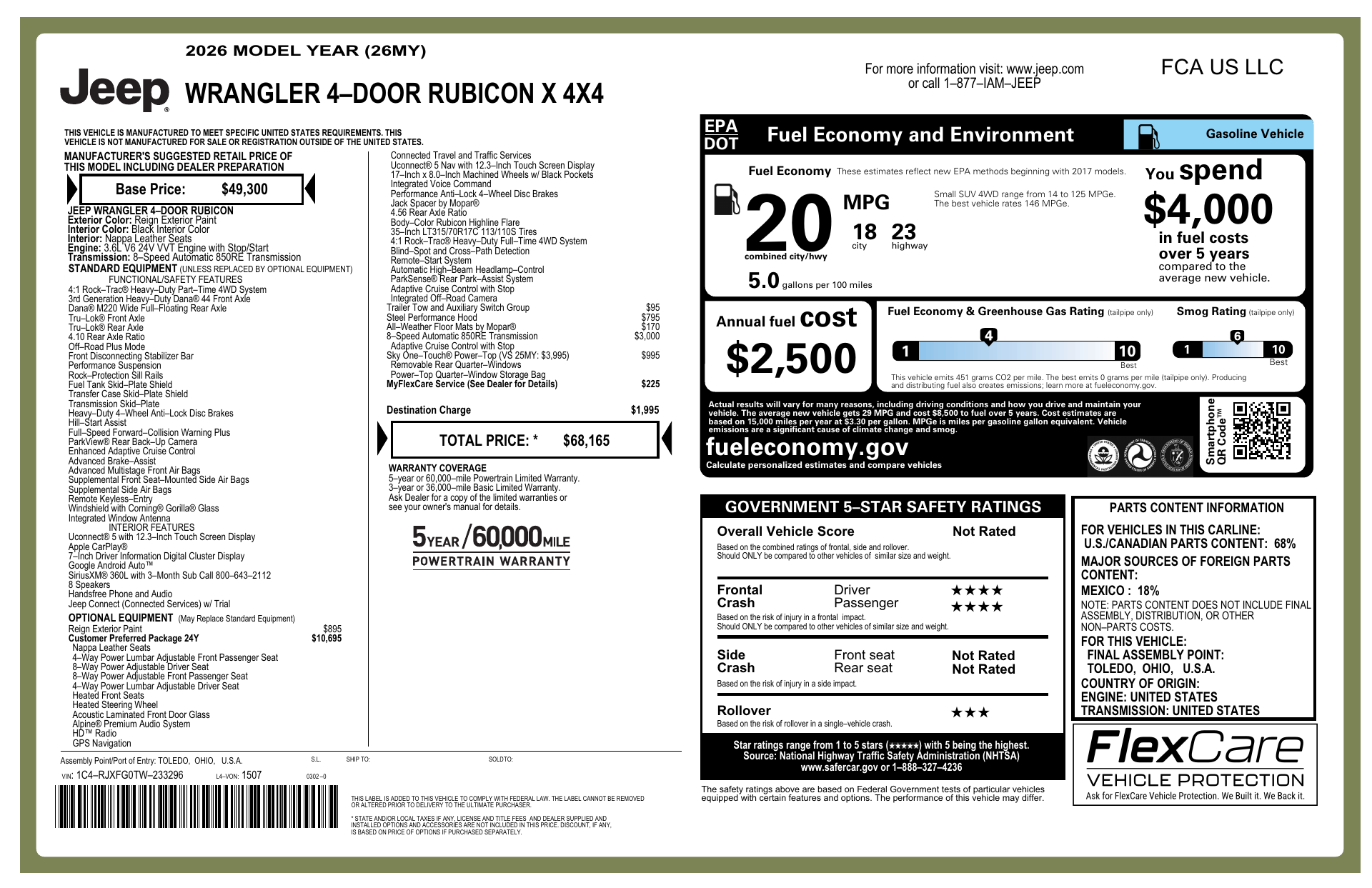 Meet the 2026 Jeep Wrangler Rubicon — built to dominate the trail and turn heads in the city. With a sleek black interior, standard 4WD, locking differential, 10.8" ground clearance and rugged LT285/70R17 tires (plus a full‑size spare), this Wrangler is ready for anything. Enjoy modern comfort and control with heated power driver seating, navigation, keyless entry with remote ignition and climate control, leather steering wheel with mounted controls, and a suite of safety tech including ABS, traction and stability control and multiple airbags. Ready for adventure? Come test‑drive the Rubicon and feel the difference.