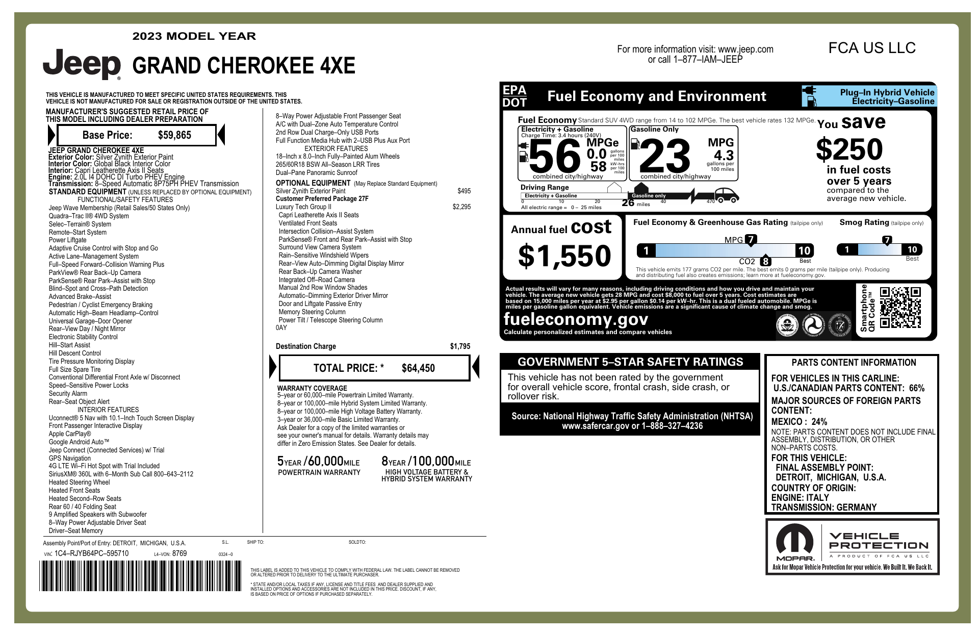 Meet the 2023 Jeep Grand Cherokee 4xe in striking Silver with a Black leather interior — a capable, feature-rich AWD SUV ready for every road. With standard 4WD, locking and limited-slip differentials, and traction & stability control, it delivers confident all-weather performance, while 265/60R18 tires and a full‑size spare keep you prepared. Inside you’ll find heated leather seats with multi-way power adjustments, a heated leather steering wheel, telescoping column and adjustable pedals for tailored comfort, plus keyless entry and remote start with climate control for everyday convenience. Safety is robust with a full suite of airbags, ABS, electronic brake assist and parking aid, and practical touches include a load‑bearing roof rack, automatic headlights and a premium AM/FM system with subwoofer. Backed by a 36/36k basic warranty and 60/60k powertrain coverage — call or stop by today and take this Grand Cherokee 4xe for a test drive.
