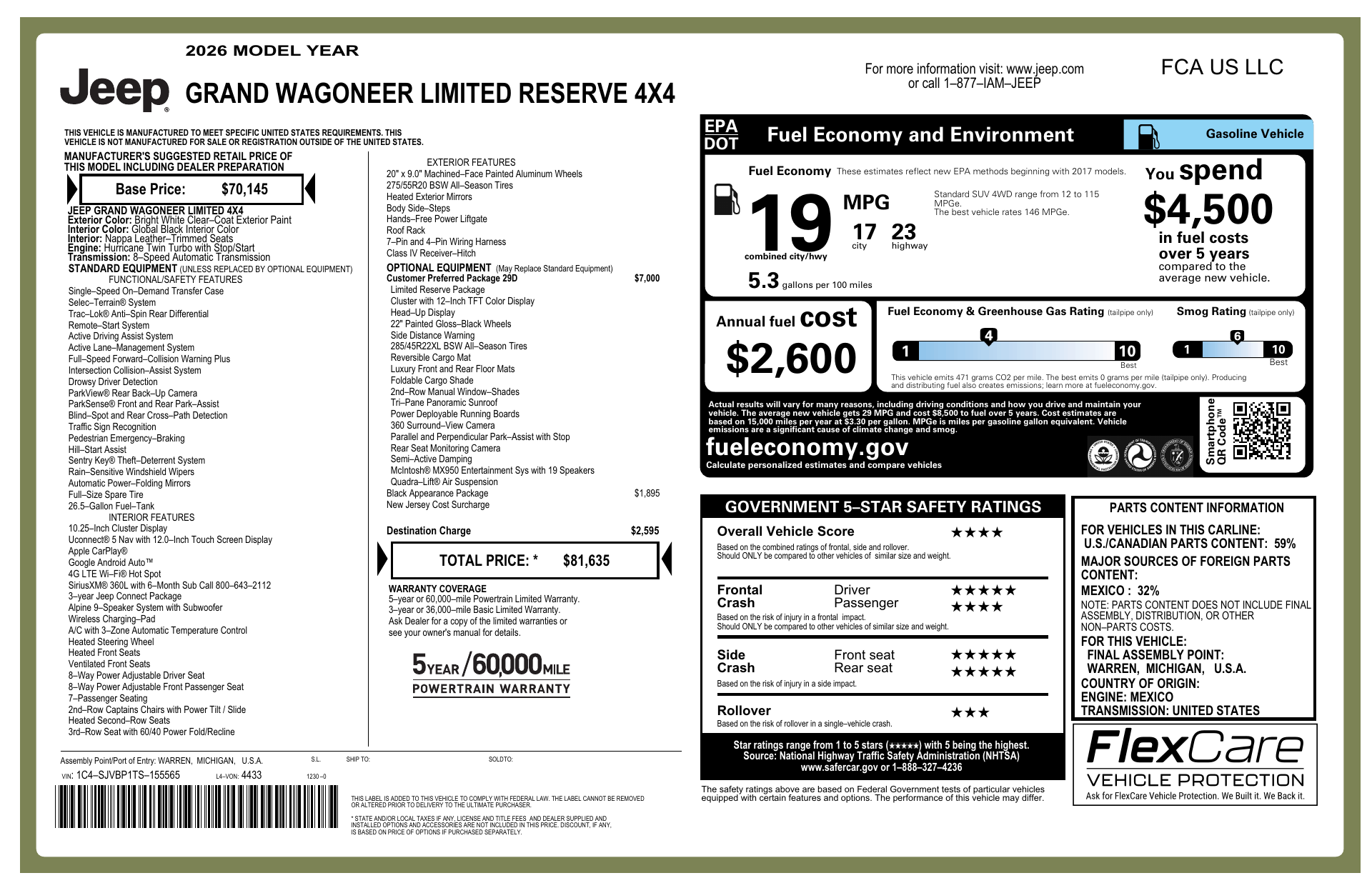 Discover the 2026 Jeep Grand Wagoneer 4WD Limited Reserve — a bold, white SUV with a sleek black leather interior that blends rugged capability and premium comfort. With full-time 4WD, spacious seating, advanced infotainment and driver-assist tech, this Wagoneer is equally at home on family road trips and weekend adventures. It also comes with the factory basic, powertrain and rust warranties — ask us for the exact terms and coverage. Ready for a closer look? Contact me to schedule a test drive and experience it today.