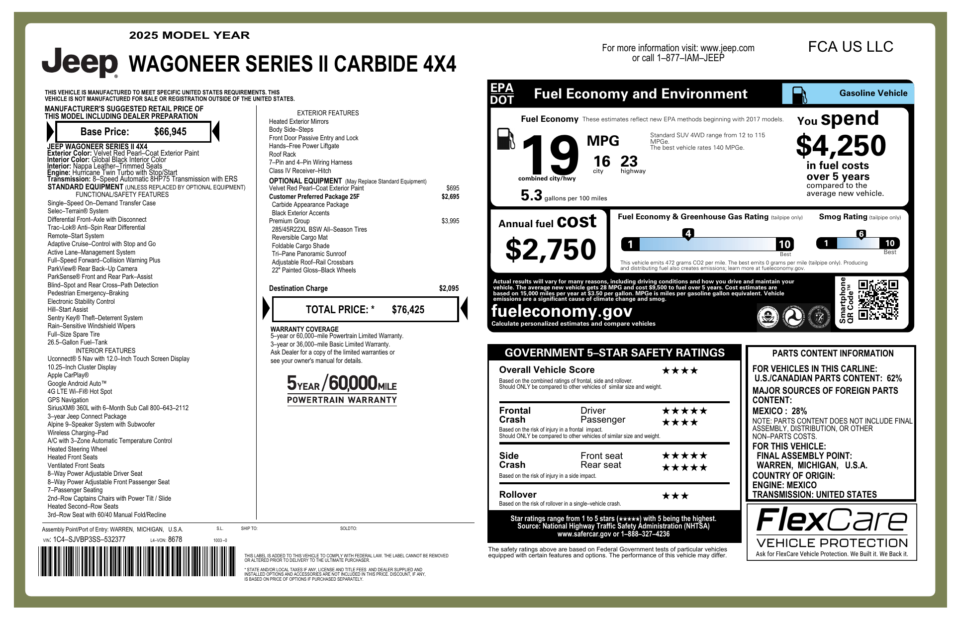 Turn heads in the 2025 Jeep Wagoneer Series II — striking Red exterior wrapped around a refined Black leather interior. This full‑size 4x4 blends capability and comfort with true 4WD, 275/55R20 wheels, generous ground clearance and a full‑size spare, plus seating for seven and adjustable, heated power seats for everyone’s comfort. Top safety and confidence come standard — multi‑airbag protection, ABS, traction and stability control — while premium conveniences like keyless entry, remote start with climate control, heated leather steering wheel and a modern infotainment suite keep every drive effortless. Ready to experience it? Come in for a test drive and let me show you why the Wagoneer is the perfect blend of luxury and off‑road muscle.