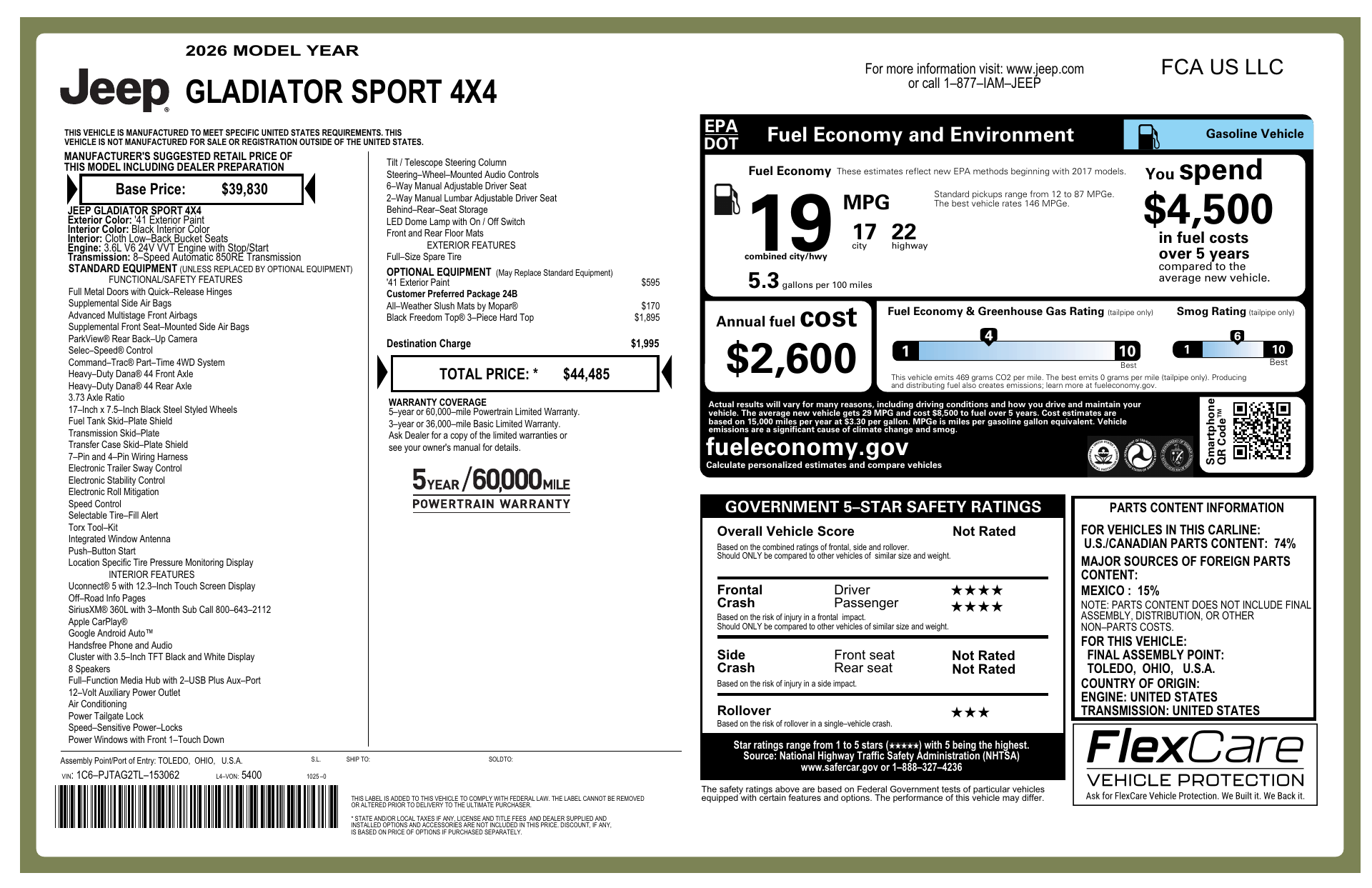 Introducing the 2026 Jeep Gladiator Sport — a rugged, go-anywhere pickup that blends utility with everyday comfort. Finished in a rich Brown exterior and a sleek Black interior, it delivers a versatile cargo bed, confident 4x4 capability, and modern creature comforts perfect for work or weekend adventures. Backed by comprehensive basic, powertrain and rust warranties for added peace of mind — ready for the road, trail, and anything in between.