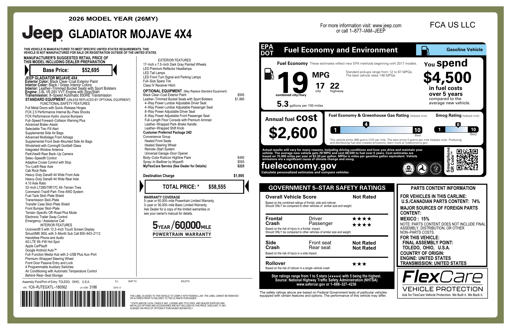 Meet the 2026 Jeep Gladiator Mojave in striking Black — the ultimate desert‑tuned pickup that blends Jeep off‑road DNA with real truck utility. Mojave‑specific suspension and a raised stance give confidence over rough terrain, while removable roof and doors, a functional bed and advanced 4x4 let you work hard and play harder. Backed by basic, powertrain and rust warranties for added peace of mind. Stop by today — let me show you how this Gladiator turns every drive into an adventure.