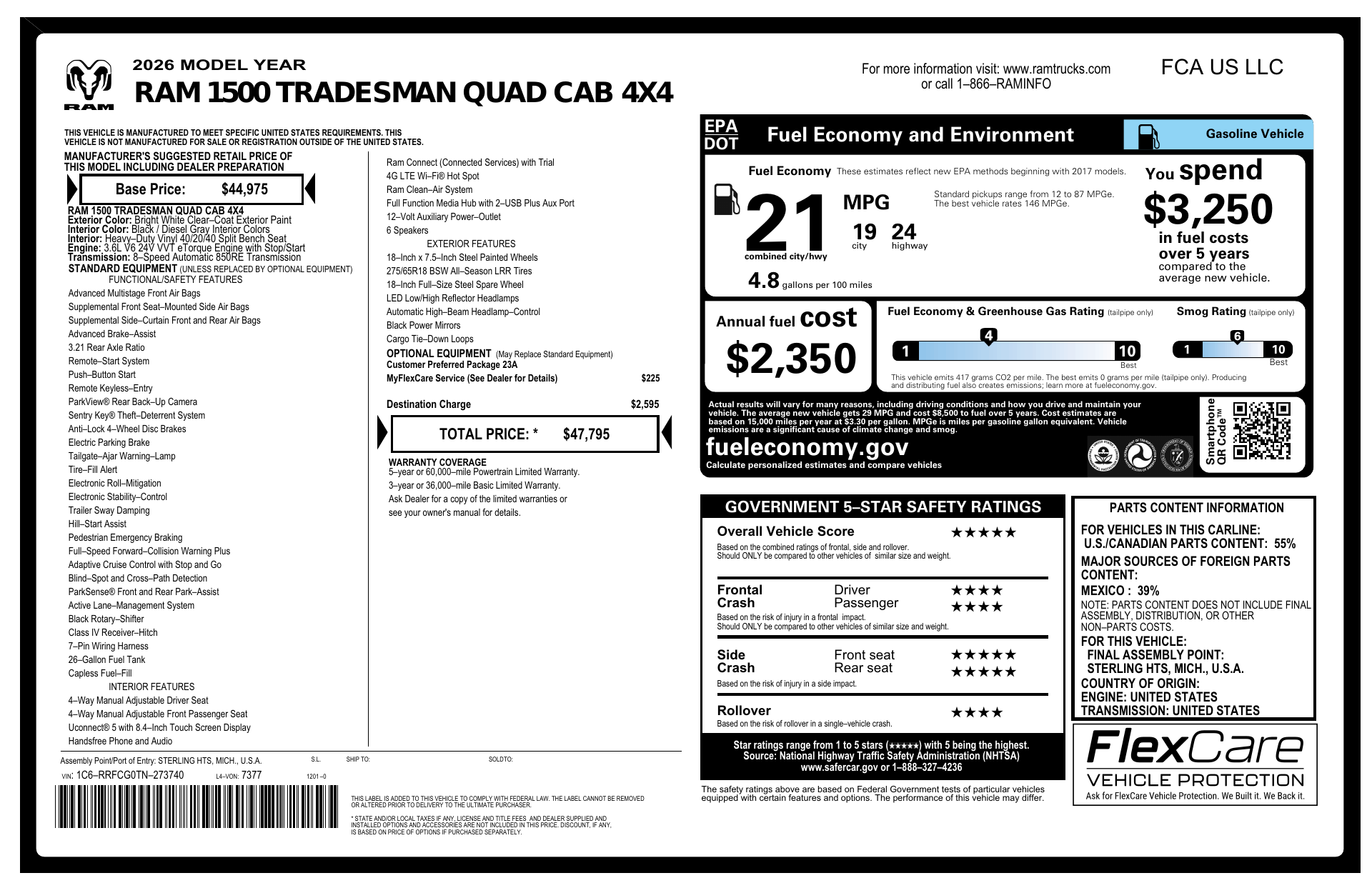 Meet the 2026 RAM 1500 Tradesman — White exterior, Black interior — a tough, no-nonsense pickup built for work and everyday confidence. Standard 4WD, heavy-duty suspension and LT275/65R18 run-flat tires give you rugged capability and peace of mind on any surface. Safety is comprehensive with multiple airbags, ABS, traction control and stability systems, while comfort and convenience come courtesy of keyless entry, remote start with climate control, power windows, heated mirrors and seating for six. Ready to get to work — stop by for a test drive and see how the Tradesman earns its name.