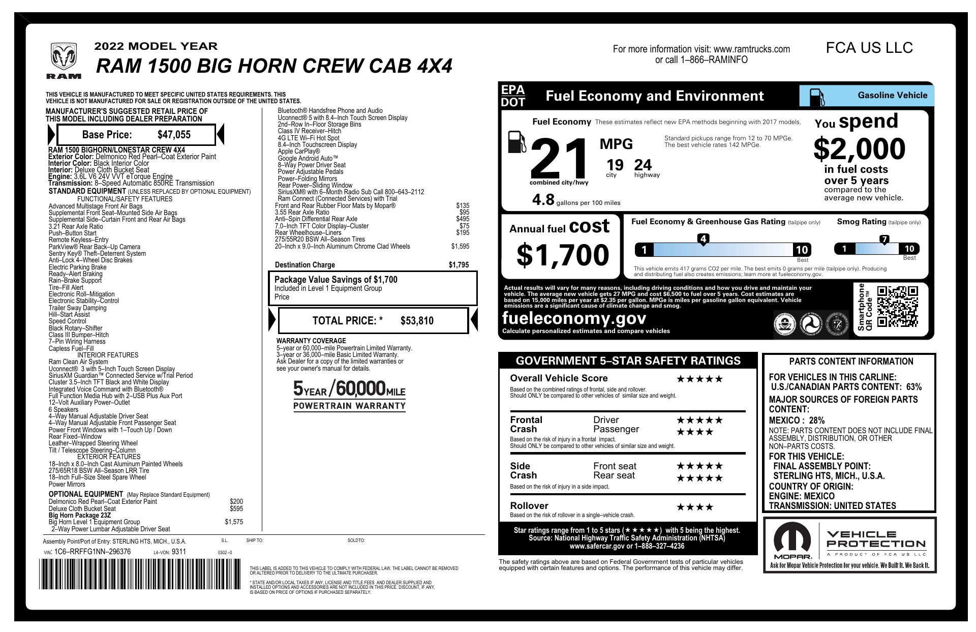 Turn heads in this striking Red 2022 RAM 1500 Big Horn/Lone Star — a rugged yet refined pickup built for work and weekend. With 4WD, skid plate protection and 275/65R18 alloy wheels, it’s ready for whatever the road (or trail) throws at you; advanced safety systems like ABS, stability control and a full suite of airbags keep you secure. Inside you’ll find premium comforts — heated front seats, heated leather steering wheel, power lumbar, power sunroof, navigation and a subwoofer — plus convenient tech like keyless entry/start and remote ignition with climate control. Room for six, plus anti-theft features and strong factory warranties make this a smart, confidence-inspiring buy. Stop by for a test drive today.
