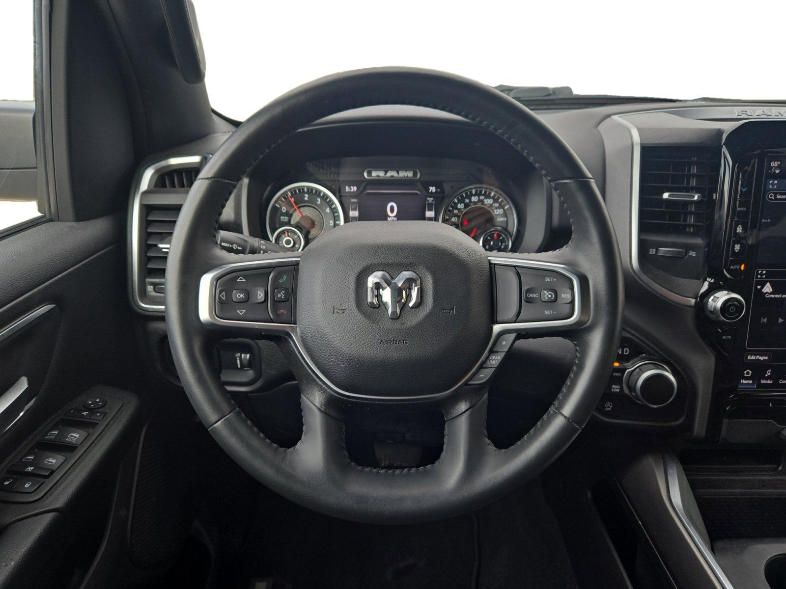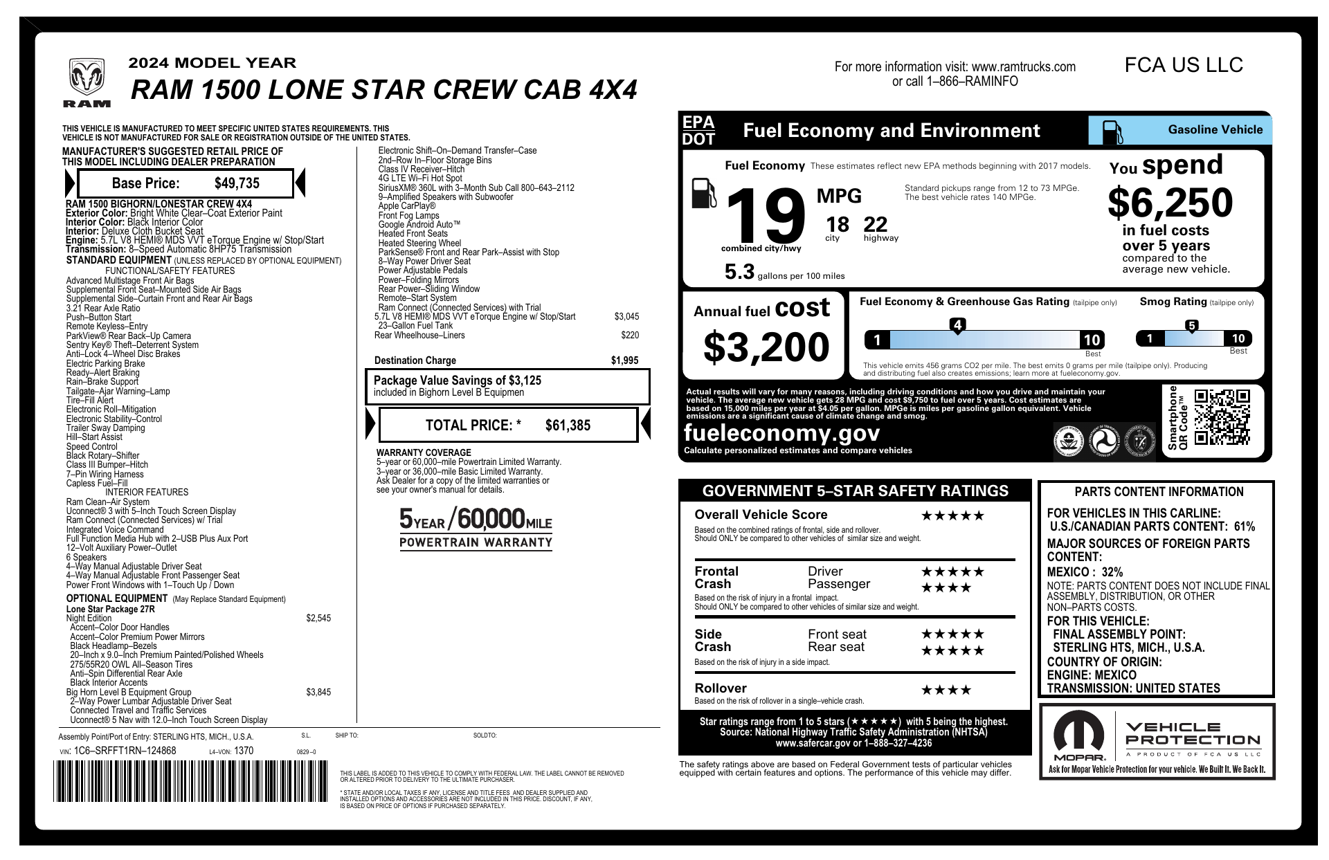 Meet the 2024 RAM 1500 Big Horn/Lone Star — striking in Bright White with a sophisticated Black interior. This truck pairs true capability (4WD, tough 275/65R18 tires and rugged suspension) with peace of mind, thanks to a comprehensive safety suite including ABS, traction and stability control, plus multiple airbags. Enjoy everyday convenience and comfort with keyless entry, remote start, dual-zone climate control and a leather-wrapped steering wheel, seating for six, and solid factory warranties. Ready for work or weekend — stop by today for a test drive and feel the difference.