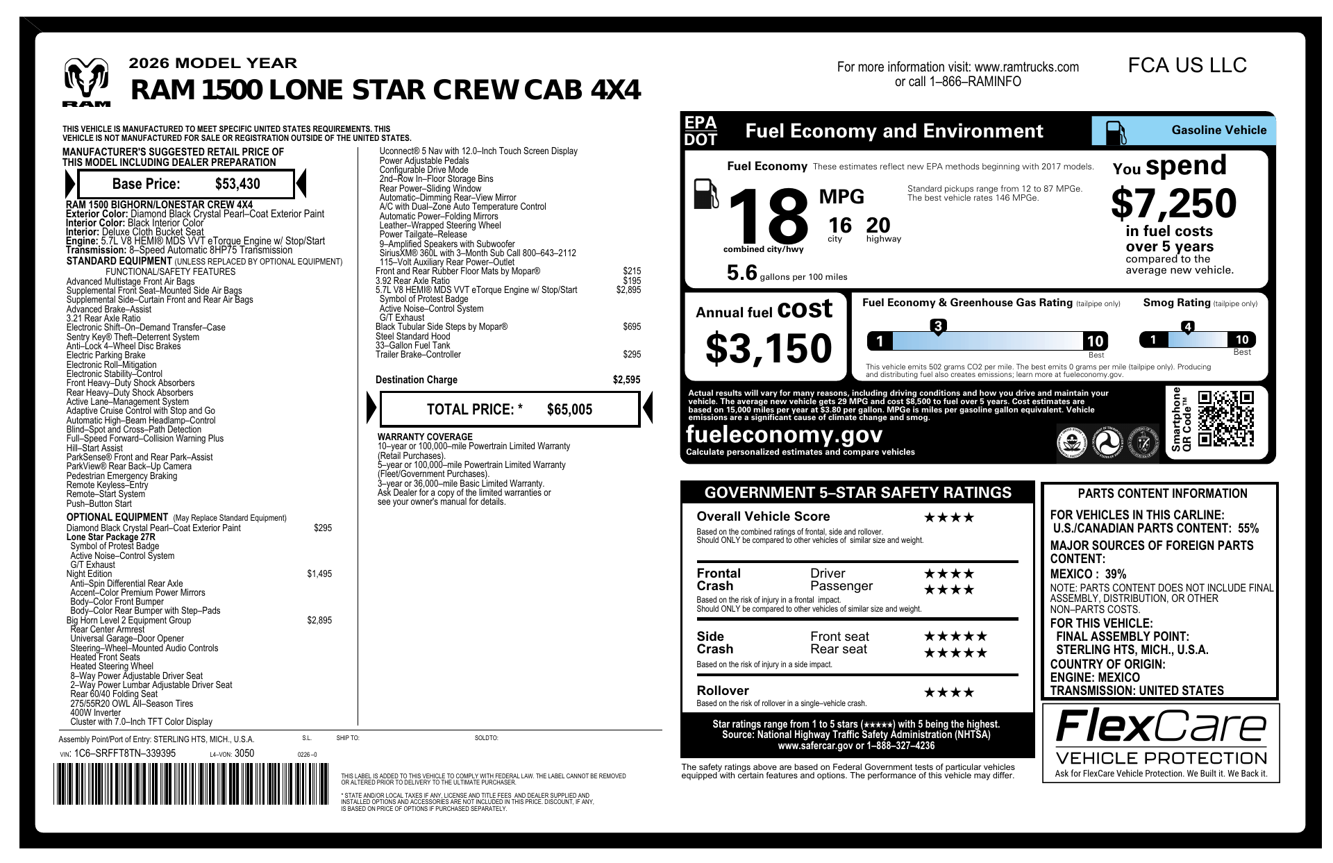 Meet the 2026 RAM 1500 Big Horn/Lone Star in sleek Black with a black interior — rugged good looks with the comfort and tech to match. Built for confidence: standard 4WD, 4-wheel ABS, electronic brake assist, traction control and vehicle stability give you sure-footed handling in all conditions. Loaded with safety and convenience — multiple airbags, electronic parking aid, keyless entry with remote start, heated mirrors, power windows and tire pressure monitoring. Comfort for five with generous leg- and headroom, dual-zone climate control, cruise control and steering-wheel audio controls, plus durable Lt275/65R18 run-flat tires. Stop in for a test drive and see how the RAM 1500 blends capability, comfort and everyday practicality.