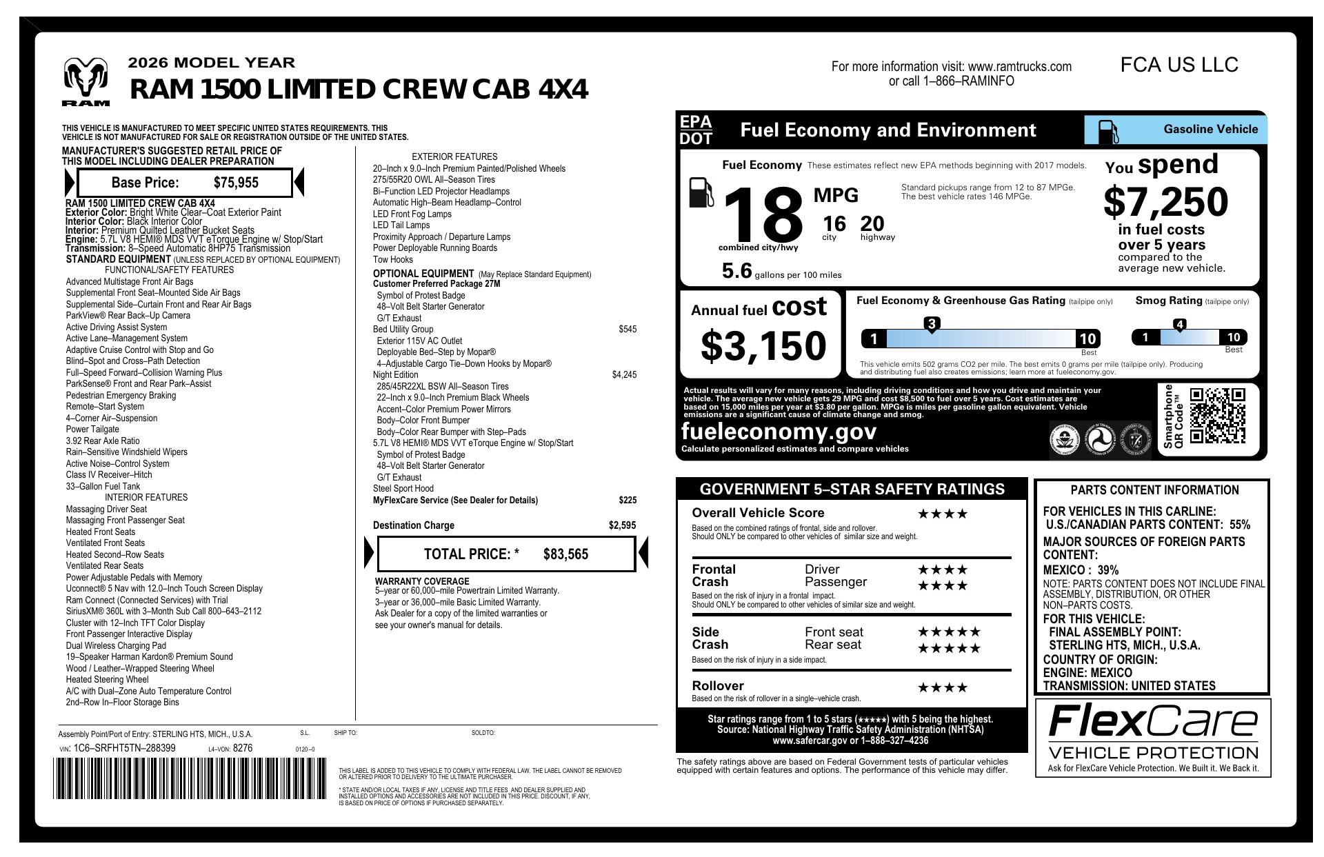 Turn heads in the 2026 RAM 1500 Limited Crew Cab in striking White — where premium comfort meets real capability. This Limited comes loaded: full-time 4WD with limited-slip and locking differentials for confident traction, Electronic Stability Control and a full suite of airbags for peace of mind, and luxurious leather heated front seats with multi-way power adjustment plus a heated leather steering wheel for all-season comfort. Enjoy modern convenience with keyless entry, remote start with climate control, power windows/mirrors, and a premium audio system with subwoofer. Riding on 275/55R20 run-flat tires with a full-size spare and backed by a 3/36 basic warranty, 10/100 powertrain and 5-year rust coverage — it’s the refined, ready-to-go pickup you’ve been waiting for. Stop by today and take one for a test drive.