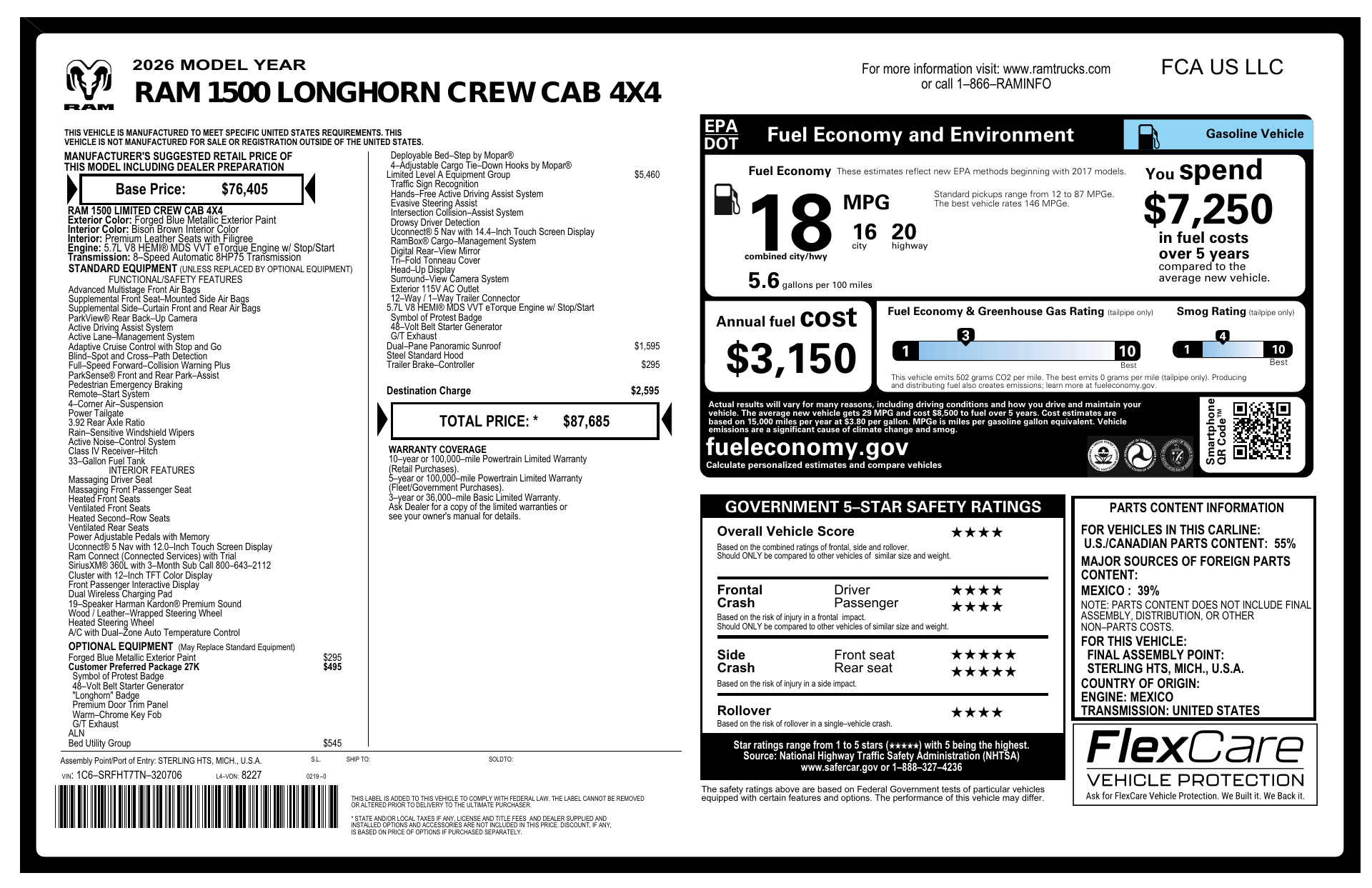 Meet the 2026 RAM 1500 Longhorn — finished in head-turning Blue with a rich Brown leather interior. This Longhorn blends premium comfort and serious capability: heated leather seats and steering wheel, power multi-adjustable seats with lumbar, telescoping steering and adjustable pedals make long drives first-class. Ready for work or play with true 4WD, locking/limited-slip differentials, traction & stability control, ABS with electronic brake assist, 275/55R20 tires and a full‑size spare (run‑flat capable). Safety is comprehensive — multiple airbags, child locks, vehicle anti‑theft and electronic parking aid — while convenience features include keyless entry, remote start with climate control, dual-zone climate and an AM/FM system with subwoofer. Backed by a 3‑year/36K basic warranty, 10‑year/100K powertrain warranty and 5‑year rust coverage. Stop by for a look — this Longhorn marries luxury and capability like few trucks can.