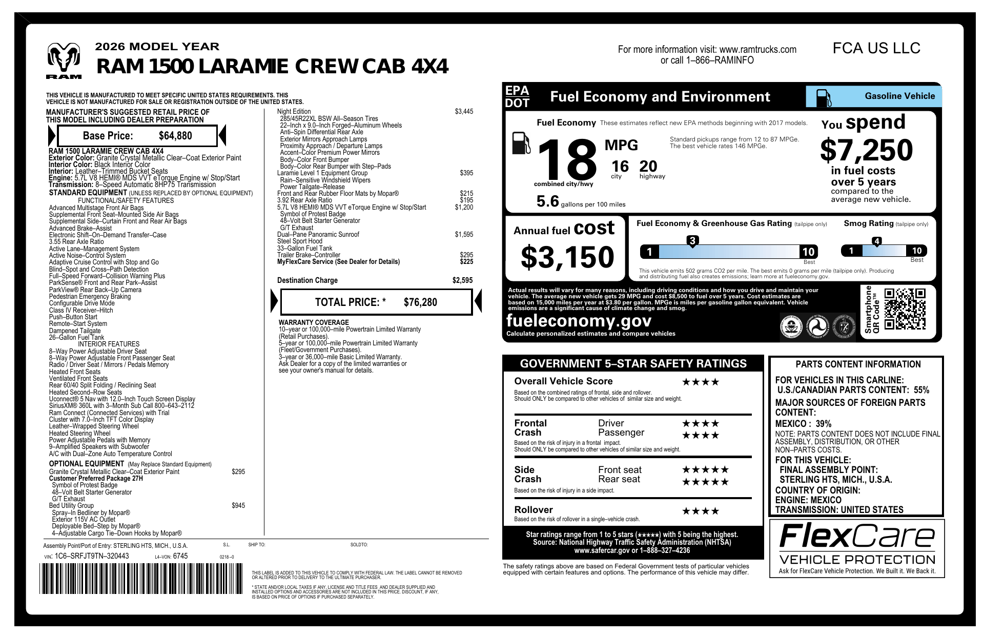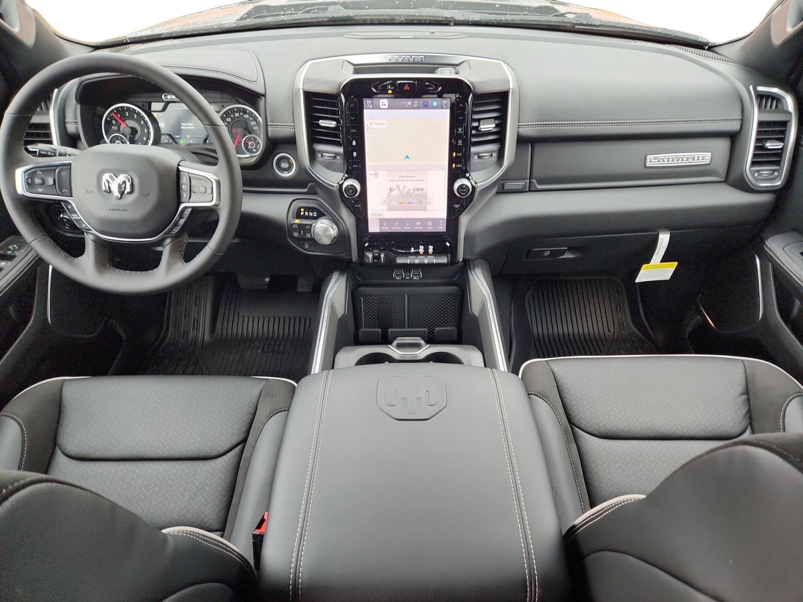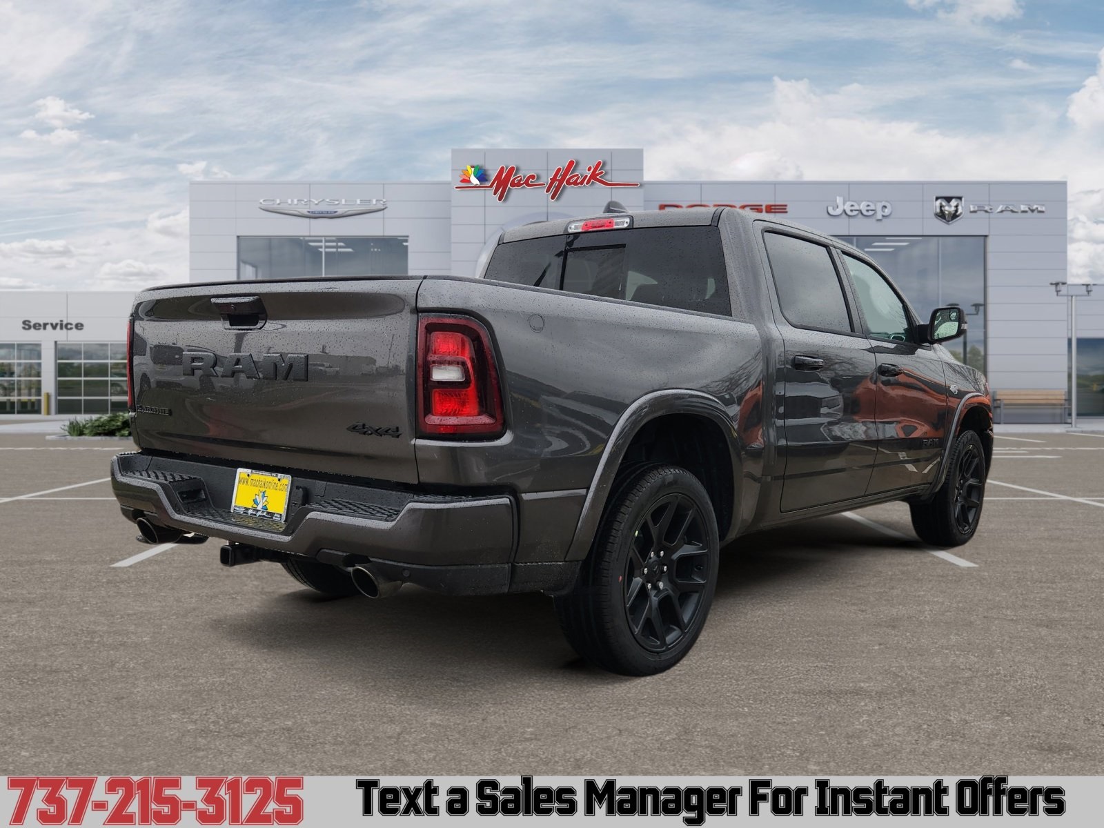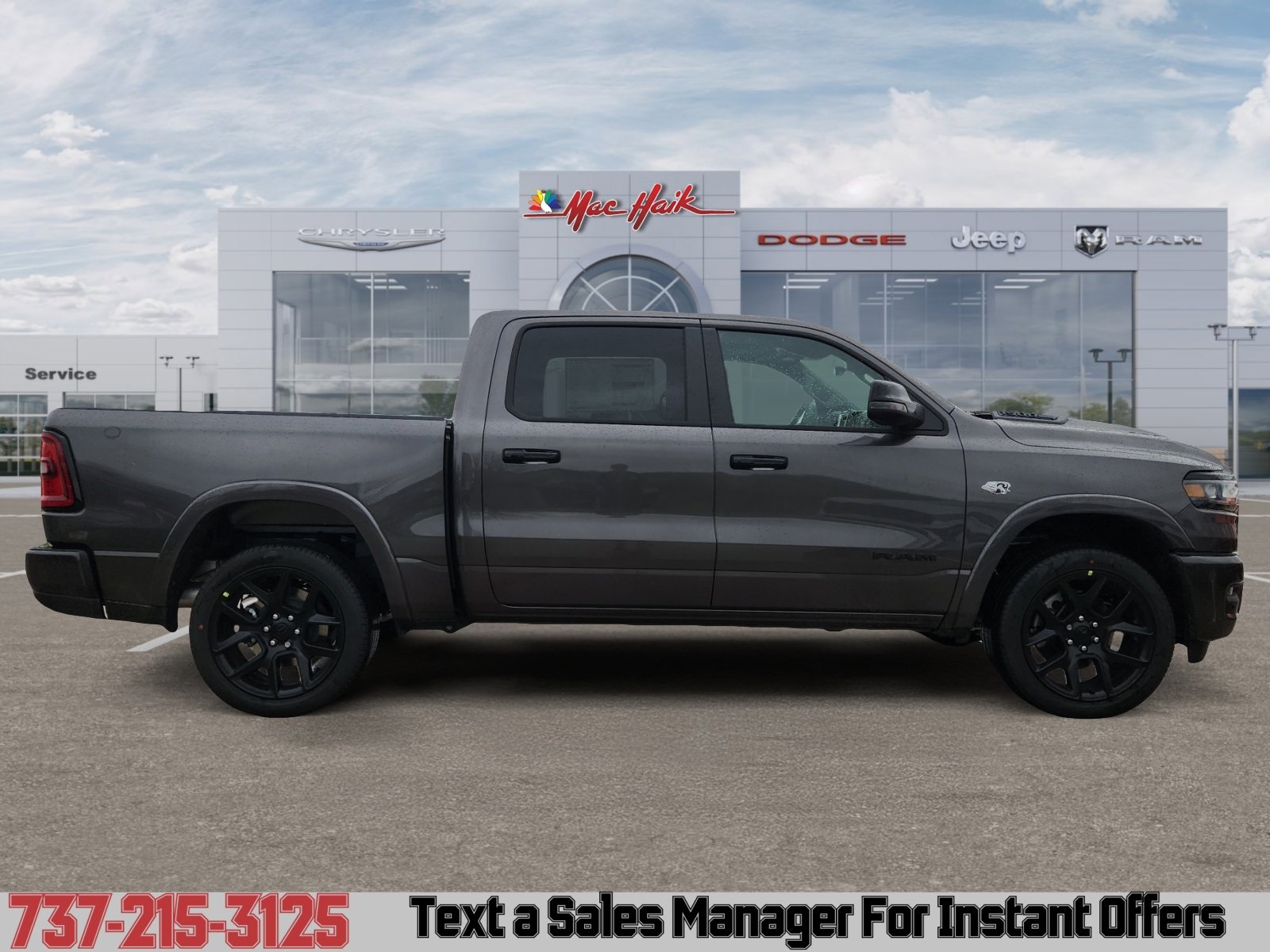 Meet the 2026 RAM 1500 Laramie — Gray exterior, Black leather interior: the perfect blend of luxury and capability. With full-time 4WD, 275/55R20 run‑flat tires and a rugged suspension, this truck is built to perform; inside you’ll find heated leather seats, heated leather steering wheel, power multi-adjustable seats with lumbar support and dual-zone climate via remote start for comfort on every drive. Safety is comprehensive: ABS, traction and stability control, multiple front and side airbags, and vehicle anti-theft systems give you confidence on the road. Roomy five-passenger interior and industry-leading peace of mind with a 10-year/100,000-mile powertrain warranty. Ready to see it and take it for a test drive today?
