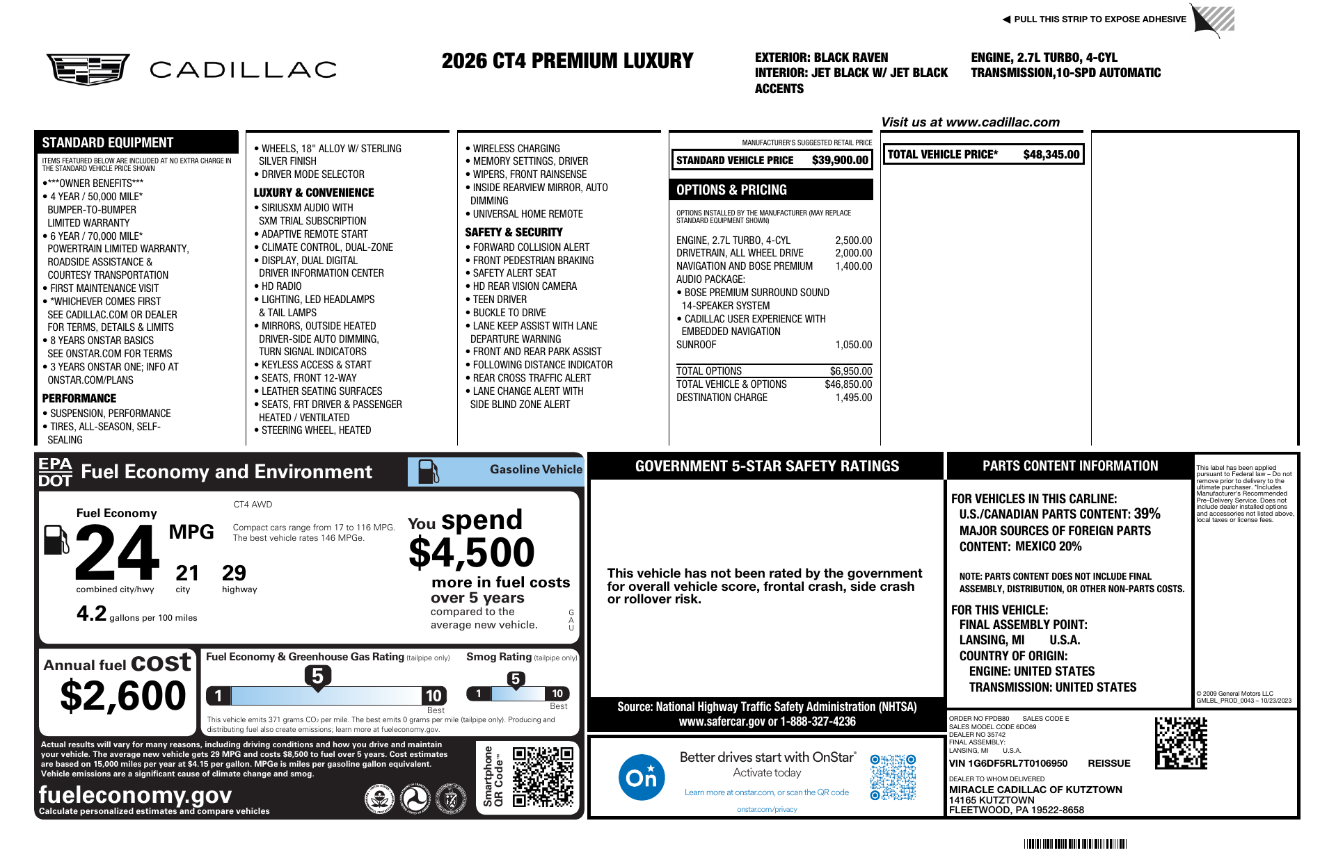 Step up to the 2026 Cadillac CT4 Premium Luxury — a compact executive sedan that blends athletic handling with first-class comfort and advanced safety. Standard anti-theft protection and child safety door locks keep your family secure, while ABS, traction control and Cadillac’s full stability and airbag suite deliver confidence in every condition. Inside, enjoy leather-trimmed heated and cooled power front seats with lumbar support, a heated leather steering wheel, dual-zone climate and intuitive navigation, plus keyless entry and remote start with climate control. Add an upgraded power sunroof, premium tech and composed independent suspension on 18" wheels — elegant, reassuring and ready for a test drive. Stop by today and experience the CT4.