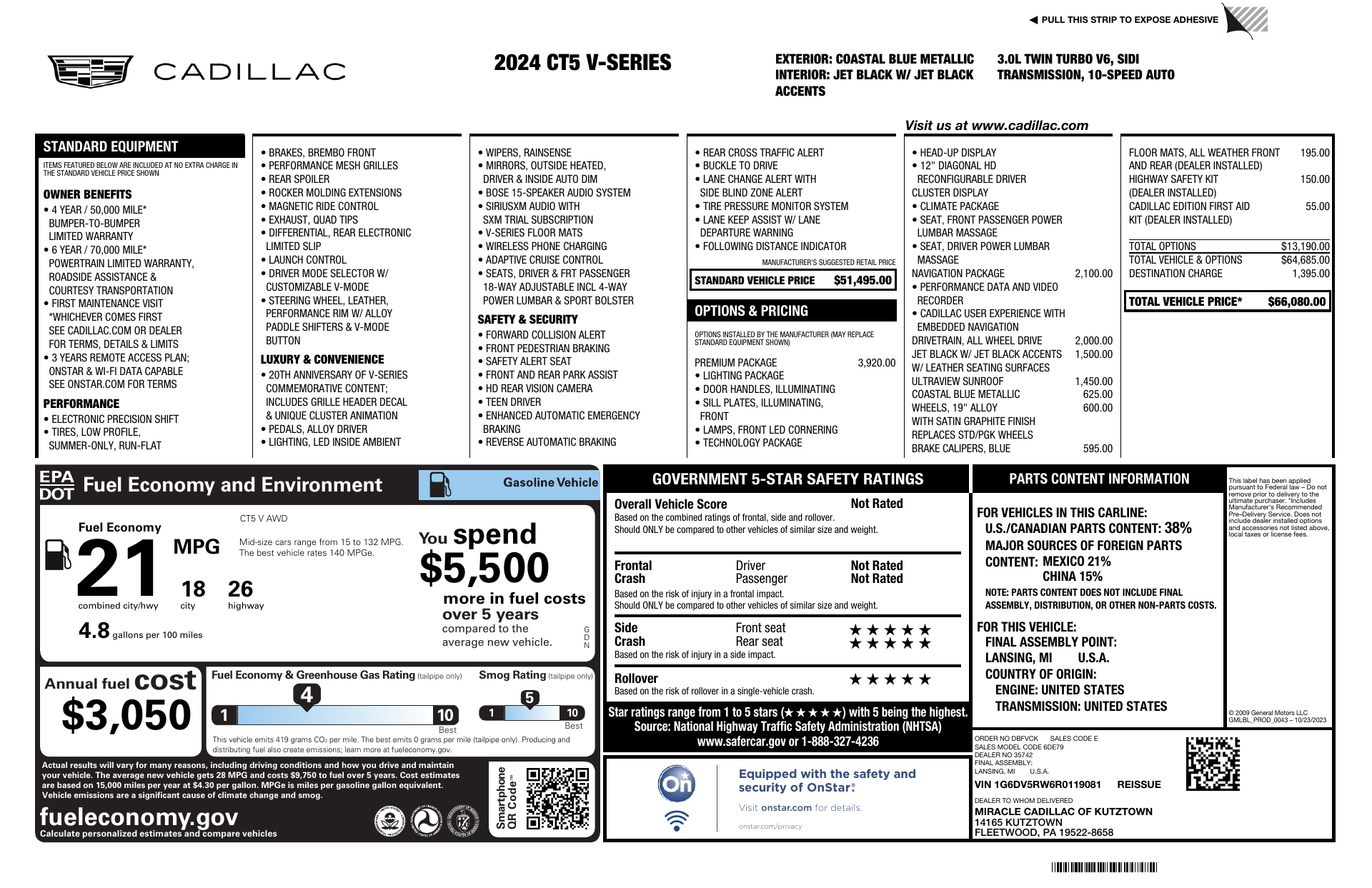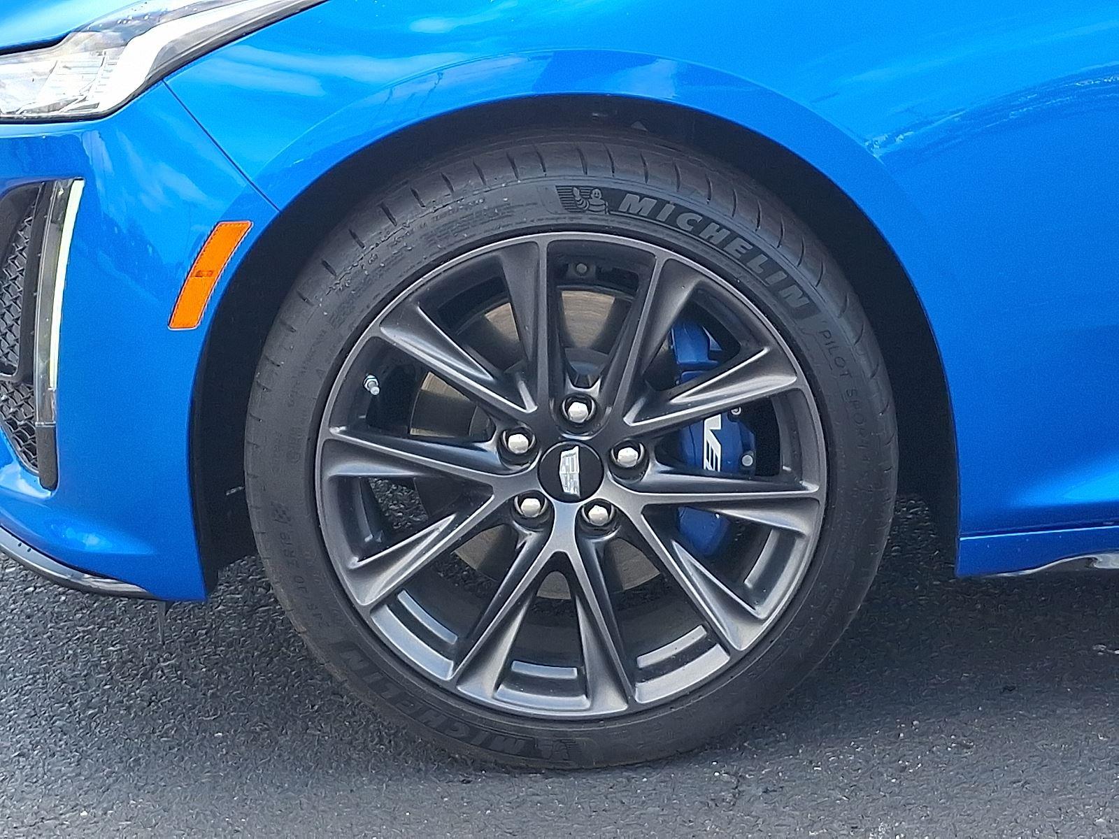 Turn heads in this 2024 Cadillac CT5-V Base — striking Blue exterior with a Black leather interior that blends sporty attitude with refined comfort. Responsive performance meets all-weather confidence thanks to AWD, limited‑slip/locking differential, 245/40R Z run‑flat tires and full 4‑wheel ABS with traction and stability control. Inside, enjoy heated leather seats, a heated leather steering wheel, multi‑adjustable power seats, telescoping steering and handy features like keyless entry, remote start with climate control and a powerful audio system with subwoofer. Safety is comprehensive with multiple airbags, side curtain protection, electronic parking aid and tire pressure monitoring. Backed by strong factory coverage (48 months/50K basic, 72 months/70K powertrain), this CT5‑V is ready to impress — call or stop by today for a test drive.