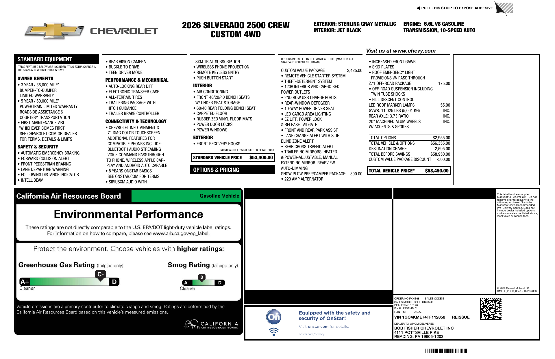Meet the 2026 Chevrolet Silverado 2500 HD Custom in sleek Gray with a Black interior — a rugged, ready-to-work pickup that blends comfort with capability. Standard 4WD, a locking differential, traction and stability controls and LT265/70R17E all-terrain tires (with full‑size spare) help you stay confident in any condition. Enjoy everyday convenience with keyless entry, remote start with climate control and heated exterior mirrors, plus roomy seating for six and generous front legroom (44.5"). Safety is comprehensive — multiple airbags, ABS and electronic brake assist — and Chevrolet backs it with a 60‑month/100,000‑mile powertrain warranty and 72‑month/100,000‑mile rust protection. Ready to work and built to last — come see it today.