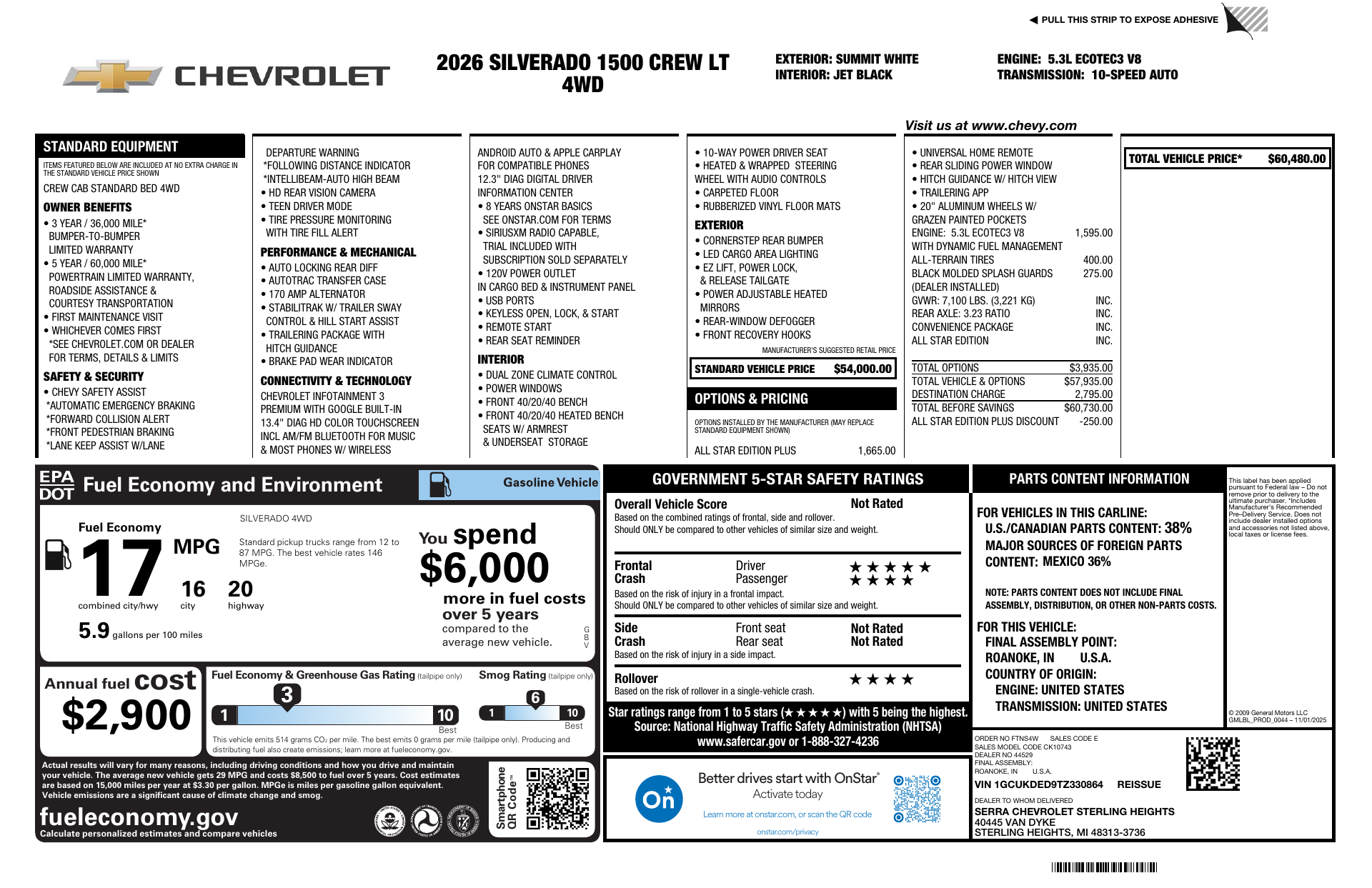 Meet the 2026 Chevrolet Silverado 1500 LT in striking Summit White — a tough, smart pickup built to work and impress. With true capability from standard 4WD, a locking differential, ABS with brake assist, traction and stability control plus 265/65R18 all‑season tires and a full‑size spare, it’s ready for anything the road (or job) throws at you. Inside you’ll find real comfort and convenience: heated front seats, heated leather steering wheel, power multi‑adjustable driver’s seat with lumbar, keyless entry and remote start with climate control, heated mirrors and cruise control. Safety is comprehensive — multiple airbags, child safety locks and vehicle anti‑theft — and it’s backed by strong coverage: 3 years/36,000 miles basic, 5 years/100,000 miles powertrain and 6 years/100,000 miles rust. Want to take it for a test drive today?