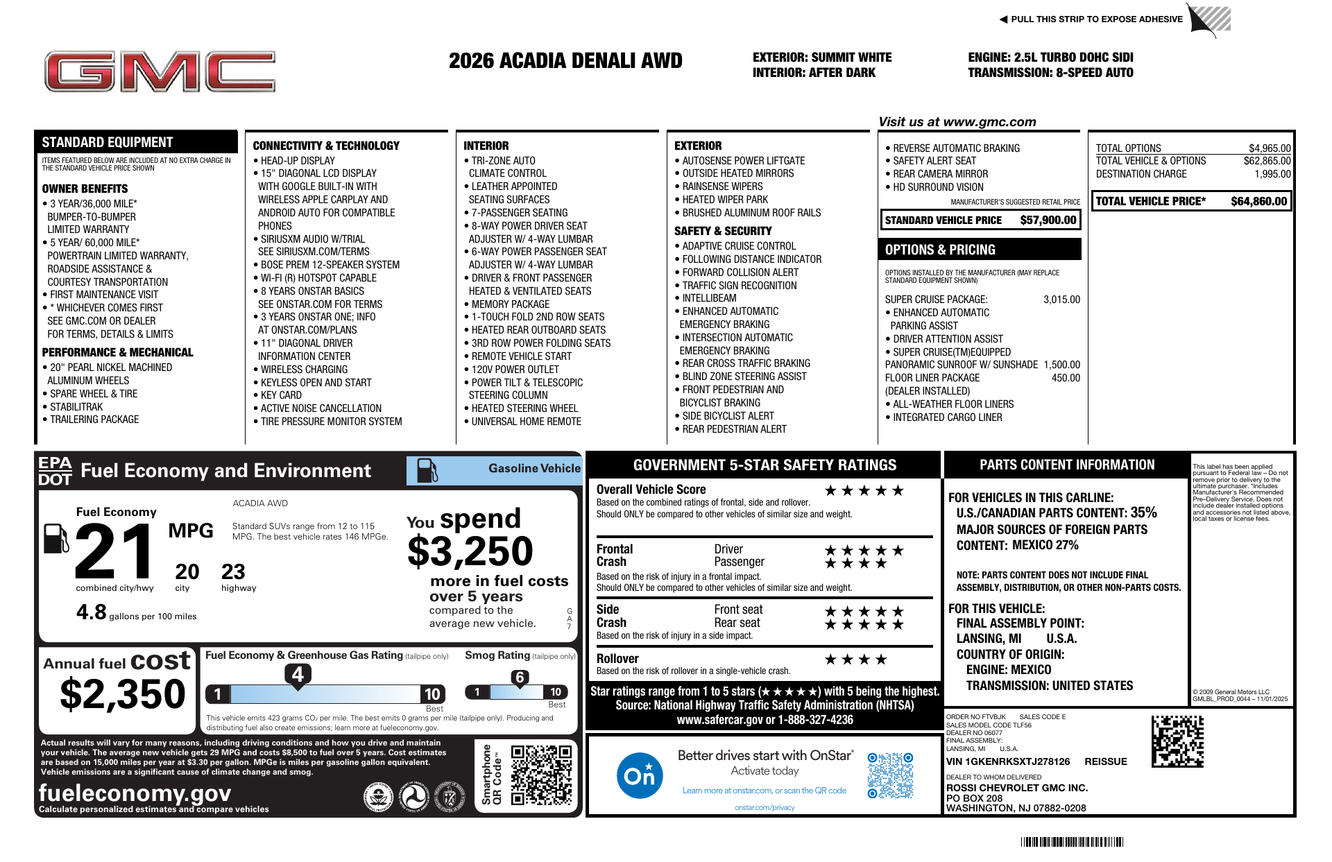 Introducing the 2026 Denali in striking Summit White with a refined Dark Gray interior — premium looks, premium comfort. Equipped for confidence with standard 4-wheel ABS, disc brakes front and rear, rack‑and‑pinion steering and independent front/rear suspension riding on 255/55R20 tires, it delivers composed handling and sure stopping. Roomy three‑row seating for seven with generous legroom (44.3" front, 41.5" rear), ample shoulder and hip room, and a commanding 120.9" wheelbase make long trips effortless. Backed by solid coverage — 36/36k basic, 60/60k powertrain and 72 months/100k rust — the Denali pairs luxury with peace of mind. Stop by or call today for a test drive.