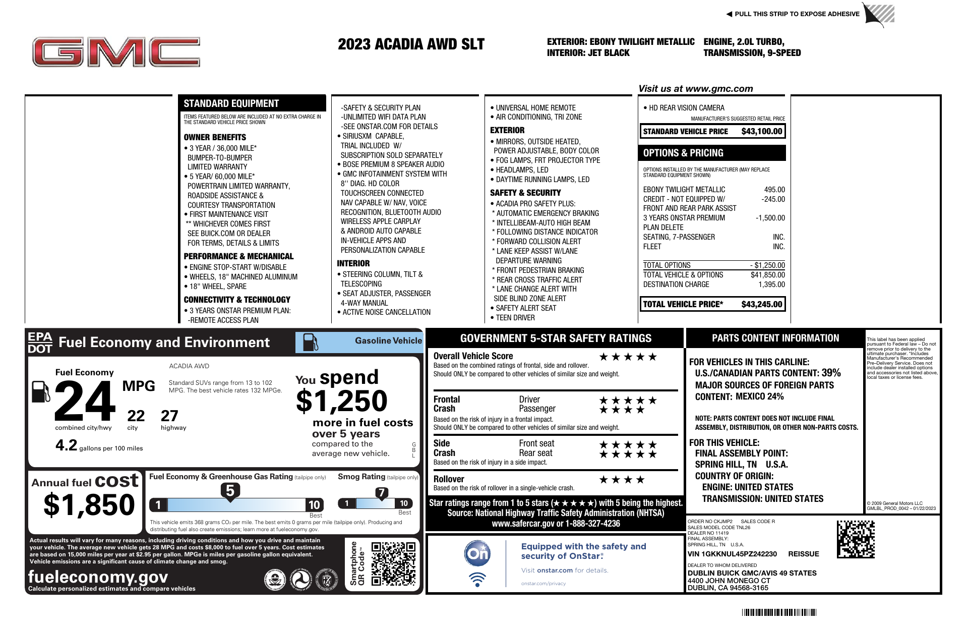 Command the road in this 2023 GMC Acadia SLT 4x4 — a sleek Black-on-Black SUV built for comfort and confidence. Enjoy capable all‑wheel drive with limited‑slip and locking differentials plus traction and stability control for surefooted handling in all conditions. Inside you’ll find heated leather seats with power adjustments and lumbar, a heated leather steering wheel, dual‑zone climate with remote start, premium audio with subwoofer, and convenient keyless entry/start. Packed with advanced safety (multiple airbags, ABS with electronic brake assist, parking aid) and backed by GM warranties (3yr/36k basic, 5yr/60k powertrain, 6yr/100k rust) — stop by today and take it for a test drive.