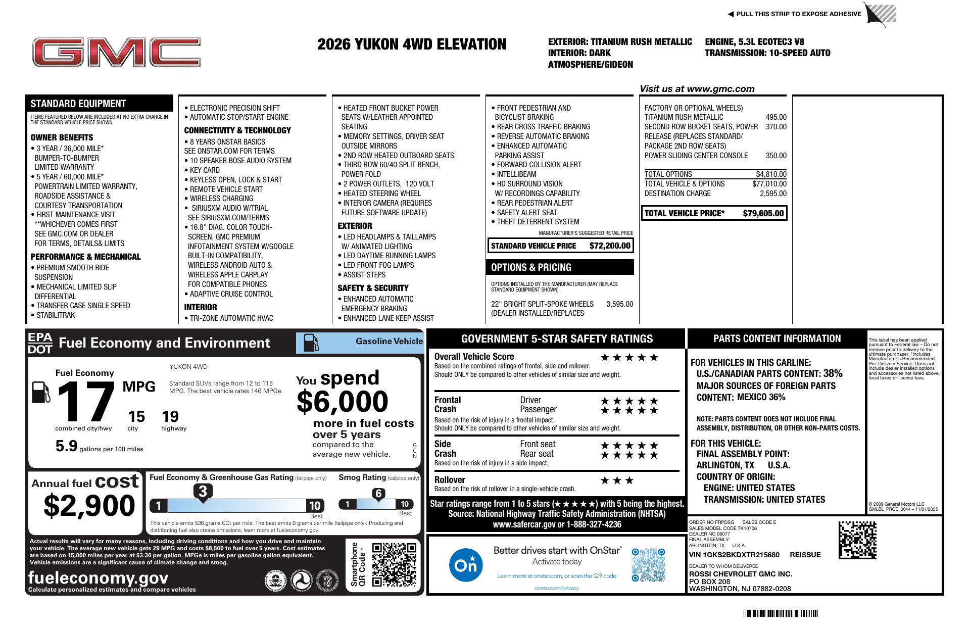 Rides on 275/60R20 tires with a full‑size spare and robust suspension for smooth handling, plus solid peace of mind from generous warranties (36 months/36,000 basic; 60 months/100,000 powertrain; 72 months/100,000 rust). Stop by today and take the Yukon Elevation for a test drive — experience capability, comfort and confidence in Dark Gray.