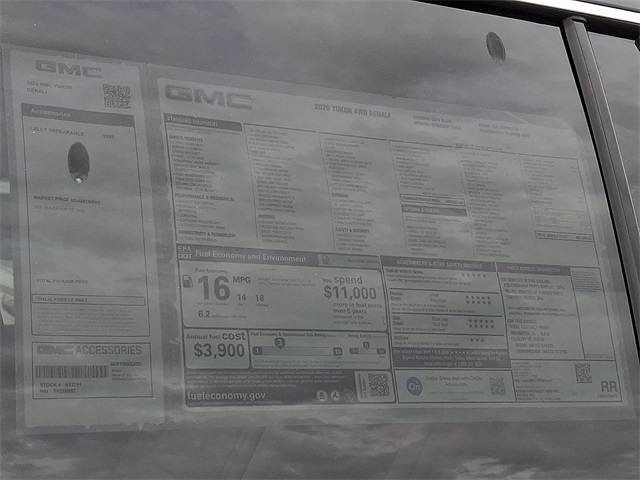 Turn heads in the 2026 GMC Yukon Denali in sleek Black — where premium comfort meets full‑size capability. Enjoy Denali luxury with leather heated and cooled front power seats, heated leather steering wheel, power lumbar and a refined cabin with navigation, subwoofer and remote ignition with climate control. Confident on any road thanks to standard 4WD, limited‑slip differential, ABS, traction and stability control. Built for family and security with child safety locks, vehicle anti‑theft system, keyless entry and an upgraded power sunroof for open‑air days. Room for seven, a full‑size spare, 20" tires, and strong factory warranties (36/36 basic, 60/100 powertrain, 72/100 rust) make this Yukon Denali a smart, stylish choice — call to schedule your test drive today.