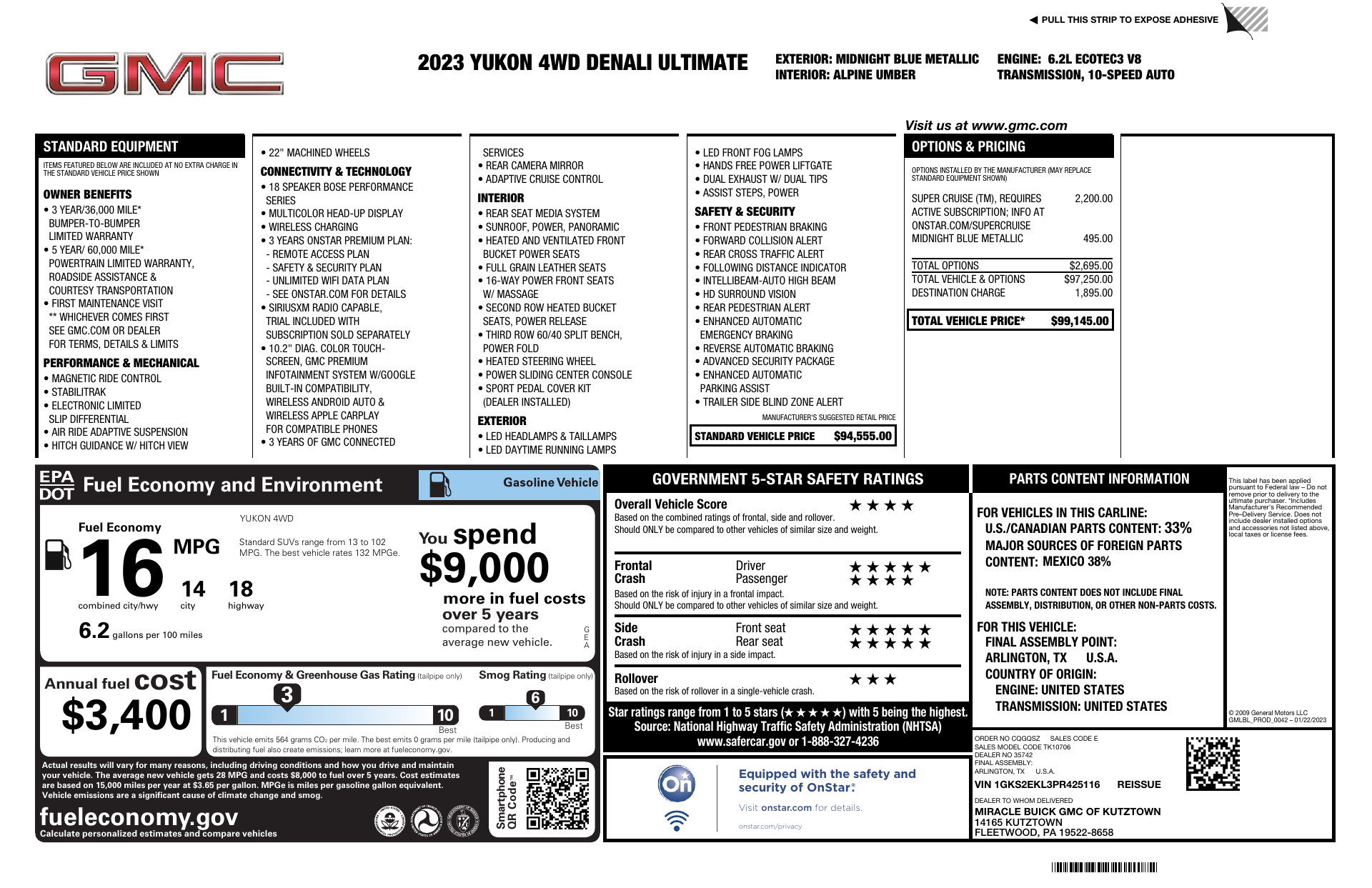 Turn heads in the striking Blue 2023 GMC Yukon Denali Ultimate — where Denali luxury meets true SUV capability. This Yukon pairs full-time 4WD and rugged 22" wheels with a comprehensive safety suite (ABS, traction & stability control, full airbags and side-curtain protection) and vehicle anti-theft for confidence on every road. Inside, enjoy handcrafted leather, heated power seats with lumbar, a heated leather steering wheel, adjustable pedals and seating for seven — plus premium sound with subwoofer and convenient keyless entry/remote start with climate control. Backed by strong warranties and built for family adventures, the Denali Ultimate is ready to impress. Stop by for a test drive and experience it for yourself.