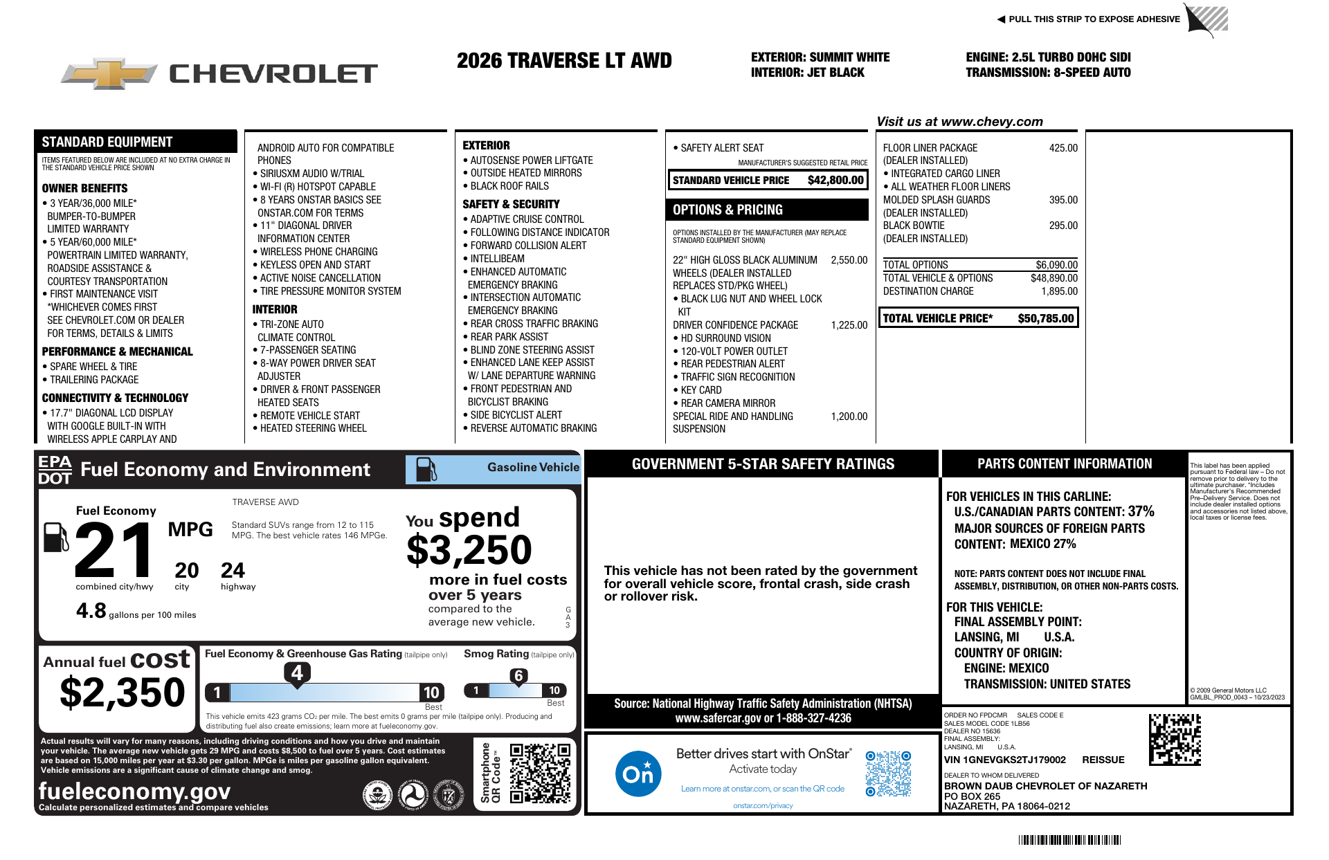 Turn heads in this striking White-on-Black 2026 Chevrolet Traverse LT — a roomy 7-passenger SUV built for comfort, confidence and peace of mind. Standard AWD, 22-inch run-flat tires, and stability/traction control give you sure-footed handling; heated front seats plus a heated leather steering wheel, power sunroof, navigation and remote start with climate control keep every drive comfortable and connected. Safety is comprehensive — multiple airbags, ABS, electronic brake assist, parking aid and vehicle anti-theft — and Chevrolet backing includes 36/36k basic, 60/60k powertrain and 72/100k rust warranties. Ready to elevate your family drives? Let’s set up a test drive today.
