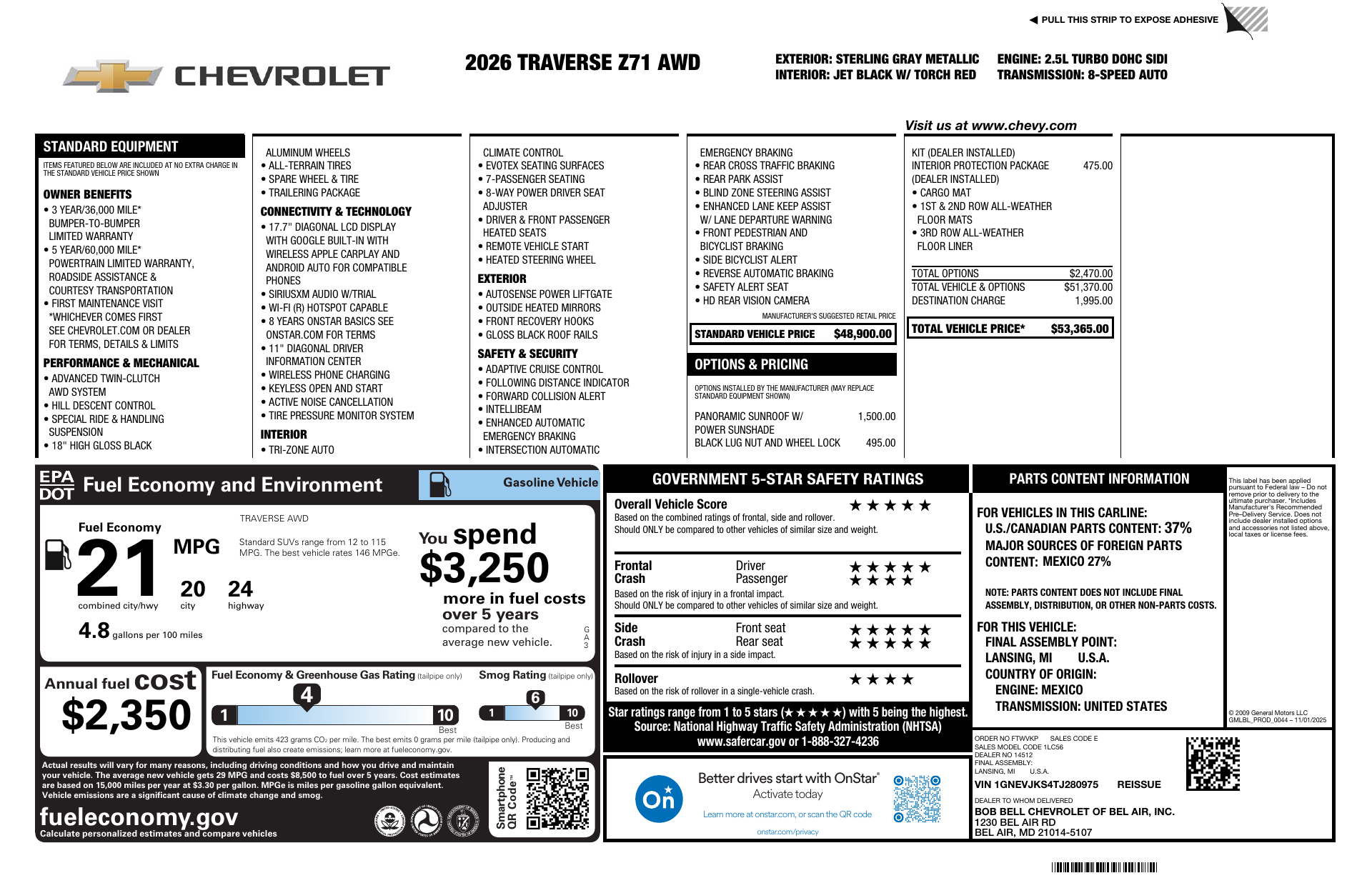 Meet the 2026 Chevrolet Traverse Z71 in sleek Gray with a Black interior — a rugged, family-ready SUV that seats seven and looks great in the driveway or on the trail. The Z71 brings true capability with standard 4WD, limited-slip differential, run-flat 265/65R18 tires and 7.8" ground clearance, so you can tackle rough roads with confidence. Inside you’ll find heated front seats, a heated leather steering wheel, navigation, keyless entry with remote start/climate control and an upgraded power sunroof for a touch of luxury. Safety is comprehensive: ABS, electronic brake assist, traction and stability control, multiple airbags, child safety locks, vehicle anti-theft and an electronic parking aid. Backed by Chevrolet’s warranties (36/36 basic, 60/60 powertrain, 72/100 rust), this Traverse Z71 is ready for your next adventure — come see it and drive it today.