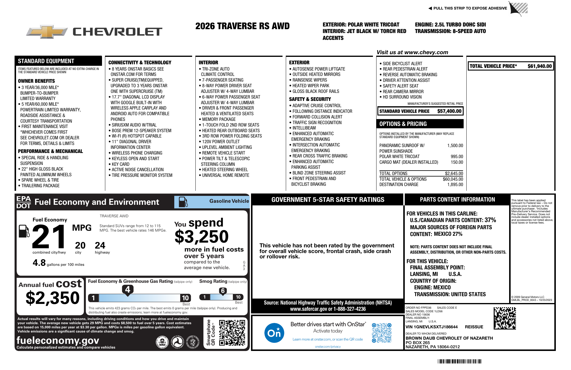 Meet the 2026 Chevrolet Traverse RS — a bold white exterior wrapped around a refined black leather interior, built for families who demand style, comfort and confidence. With standard AWD, advanced stability and traction control, and a full suite of airbags, this Traverse puts safety first without sacrificing performance.