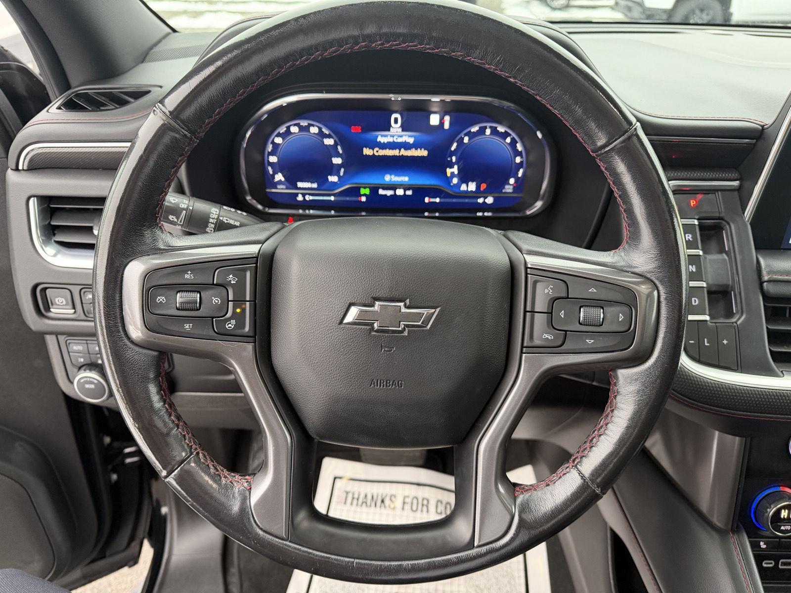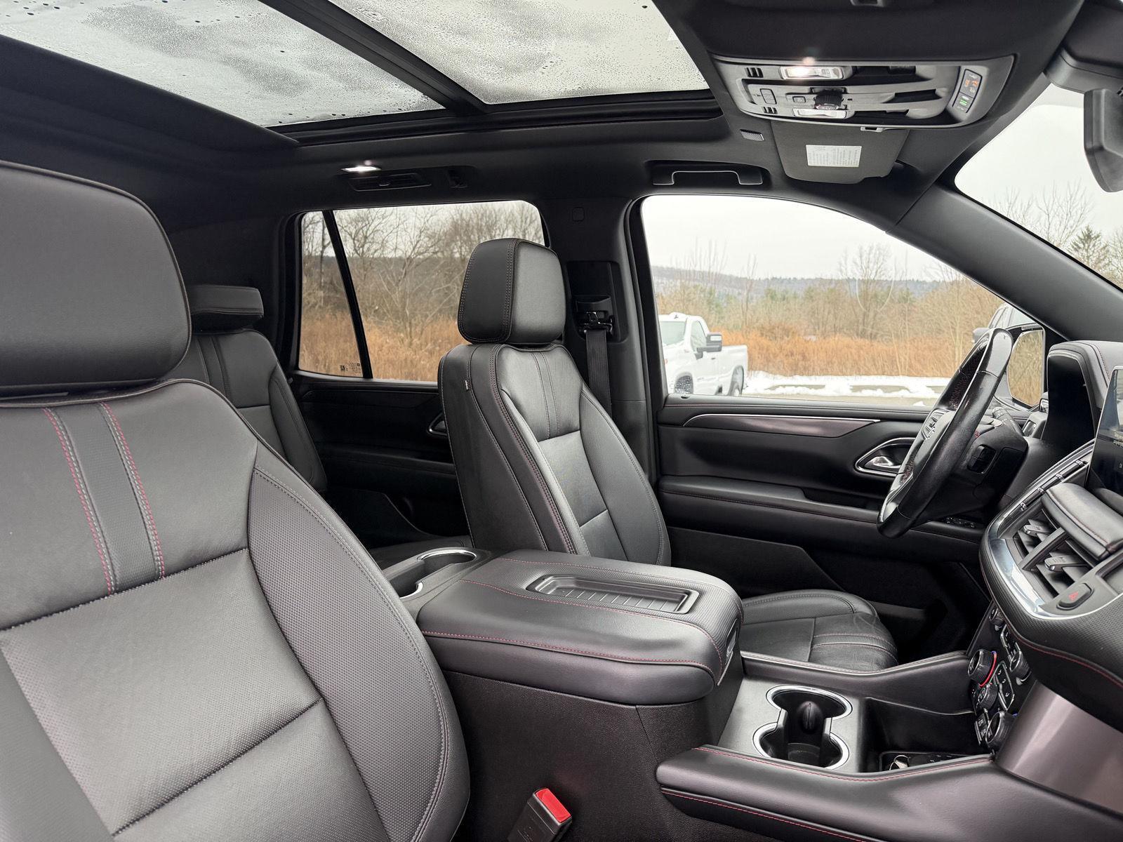 Turn heads in the 2022 Chevrolet Tahoe RST — sleek Black exterior paired with a bold Red leather interior for unmistakable presence. Ready for anything with standard 4WD, ABS, traction & stability control and a limited‑slip differential, plus beefy P275/50R22 alloy wheels. Enjoy comfort and tech like heated leather front seats, heated steering wheel, driver power memory seat, power sunroof, premium subwoofer, and remote ignition with climate control — all with convenient keyless entry/start. Built for families with seating for eight, comprehensive airbags and vehicle anti‑theft protection, and backed by Chevy’s warranties (3/36 basic, 5/60 powertrain, 6/72 rust). Stop by today and take this standout Tahoe for a test drive.