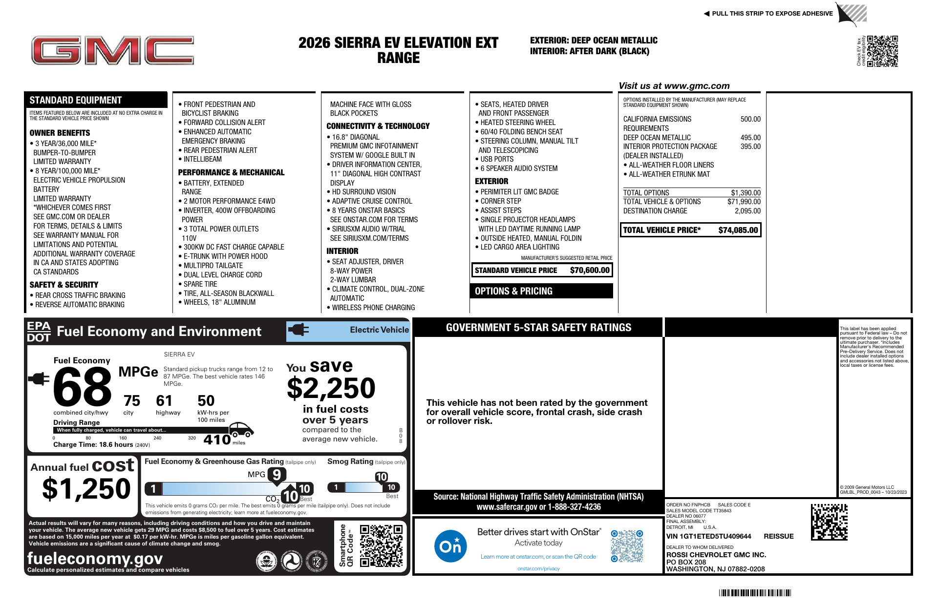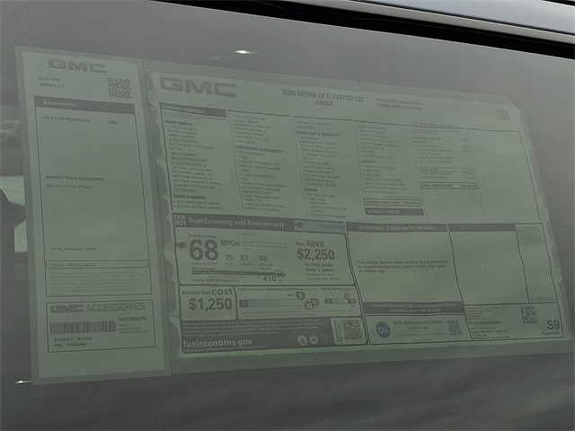 Introducing the 2026 GMC Sierra EV Elevation in striking Blue with a sleek Black interior — an all‑electric truck that pairs serious capability with modern comfort. Standard 4WD, advanced braking and stability systems (ABS, electronic brake assist, traction control), and comprehensive airbags give you confident control and safety, while tech-savvy features like navigation, keyless entry with remote start/climate control, and a heated steering wheel keep every drive easy and comfortable. Enjoy heated front seats, a power‑adjustable driver seat, automatic headlights, heated mirrors and a full‑size spare — plus a roomy cabin with over 44 inches of legroom front and rear and seating for five. Backed by solid coverage including a 36‑month/36,000‑mile basic warranty and 72‑month/100,000‑mile rust protection — come see it and take a test drive today.