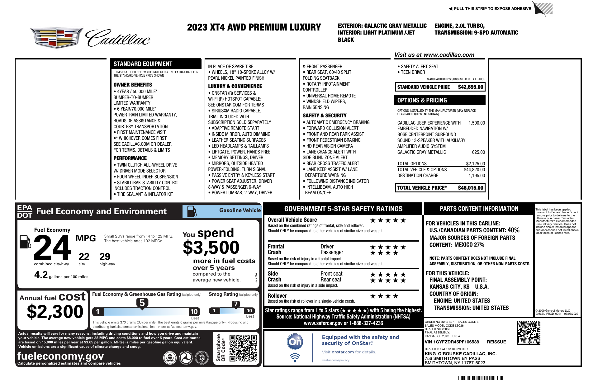 Step up to luxury with this 2023 Cadillac XT4 Premium Luxury in sleek Grey with a Black leather interior — a compact SUV that blends upscale style with everyday capability. Enjoy confident all‑wheel drive with ABS, traction and stability controls plus a limited‑slip differential, comprehensive airbag protection, and an anti‑theft system for peace of mind. Stay comfortable and connected with heated leather seats and steering wheel, keyless entry with remote start/climate control, and a premium audio system with subwoofer. Backed by Cadillac warranties (48 months/50k basic, 72 months/70k powertrain), this XT4 is ready for your driveway — call today to take it for a test drive.