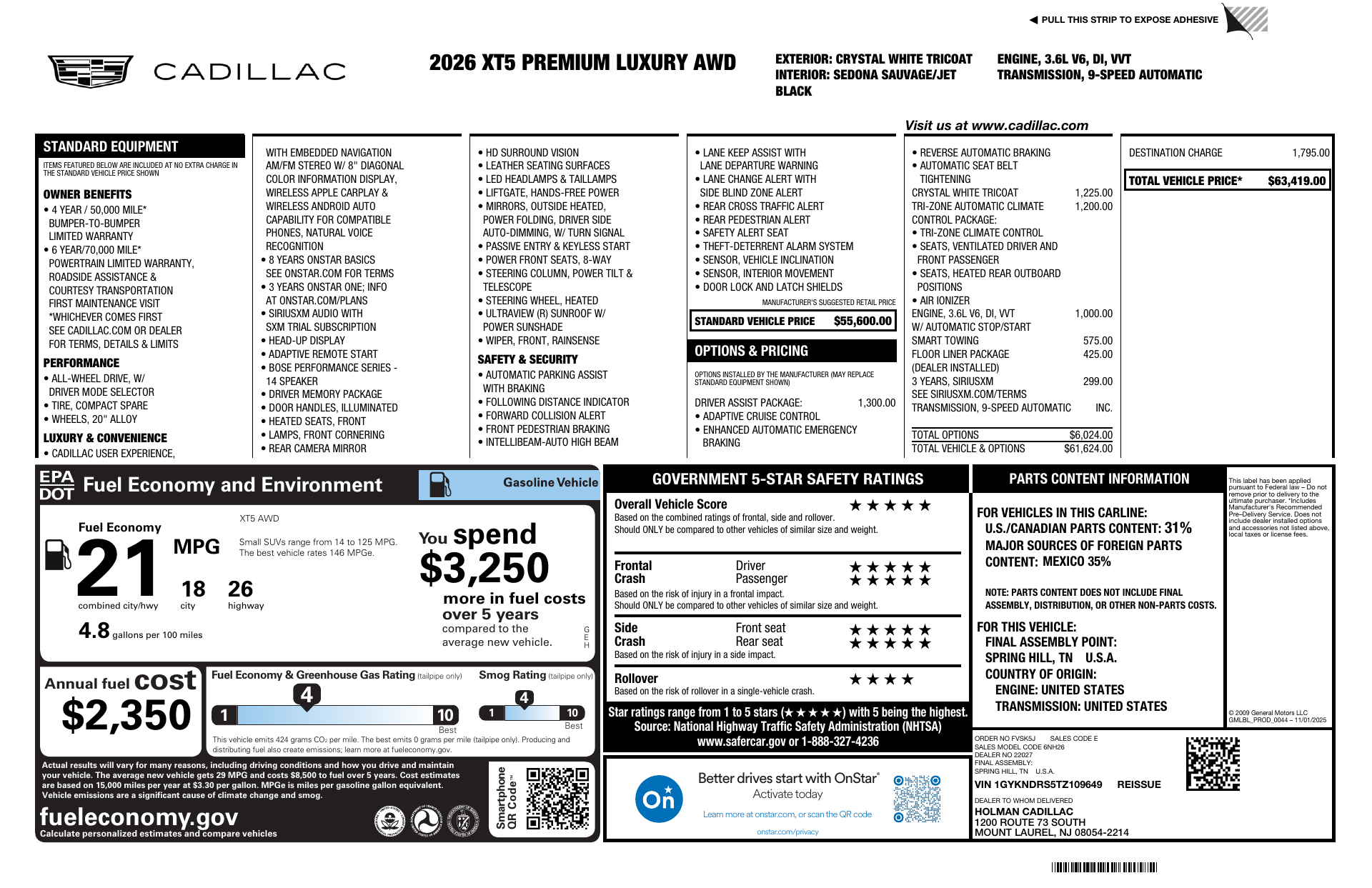 Elevate every drive in the 2026 Cadillac XT5 Premium Luxury — striking Summit White with a refined Black leather interior. Standard AWD, run‑flat tires and a full safety suite (ABS, traction & stability control, multiple airbags and vehicle anti‑theft) deliver confidence on every road. Enjoy true comfort and tech: heated & cooled front seats, heated leather steering wheel, power sunroof, navigation, keyless entry and remote start with climate control. Backed by strong coverage — 48 months/50,000 mi basic, 72 months/70,000 mi powertrain — this XT5 blends luxury, safety and peace of mind. Come see it and take one for a test drive.