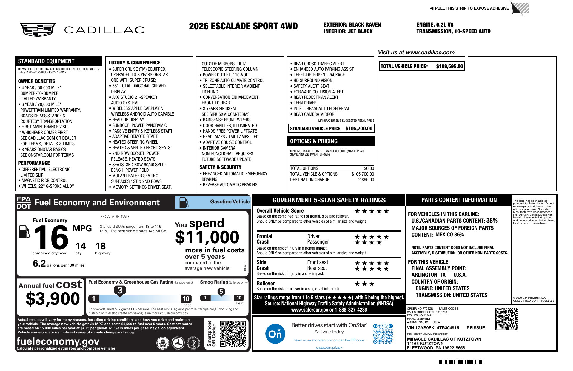 Discover the 2026 Cadillac Escalade 4WD Sport — where full-size presence meets refined capability. With standard 4WD, advanced anti-theft protection (including braking and traction intervention), and a full suite of airbags and stability/traction systems, this Escalade puts safety and confidence first. Inside, enjoy heated leather seats, a heated leather-wrapped steering wheel, multi-zone climate with remote start, and a premium audio system with subwoofer — all for up to seven passengers in roomy, first-class comfort. Finished with keyless entry, automatic headlights and commanding 22-inch tires, it’s the luxury SUV built to perform. Ready for a test drive?