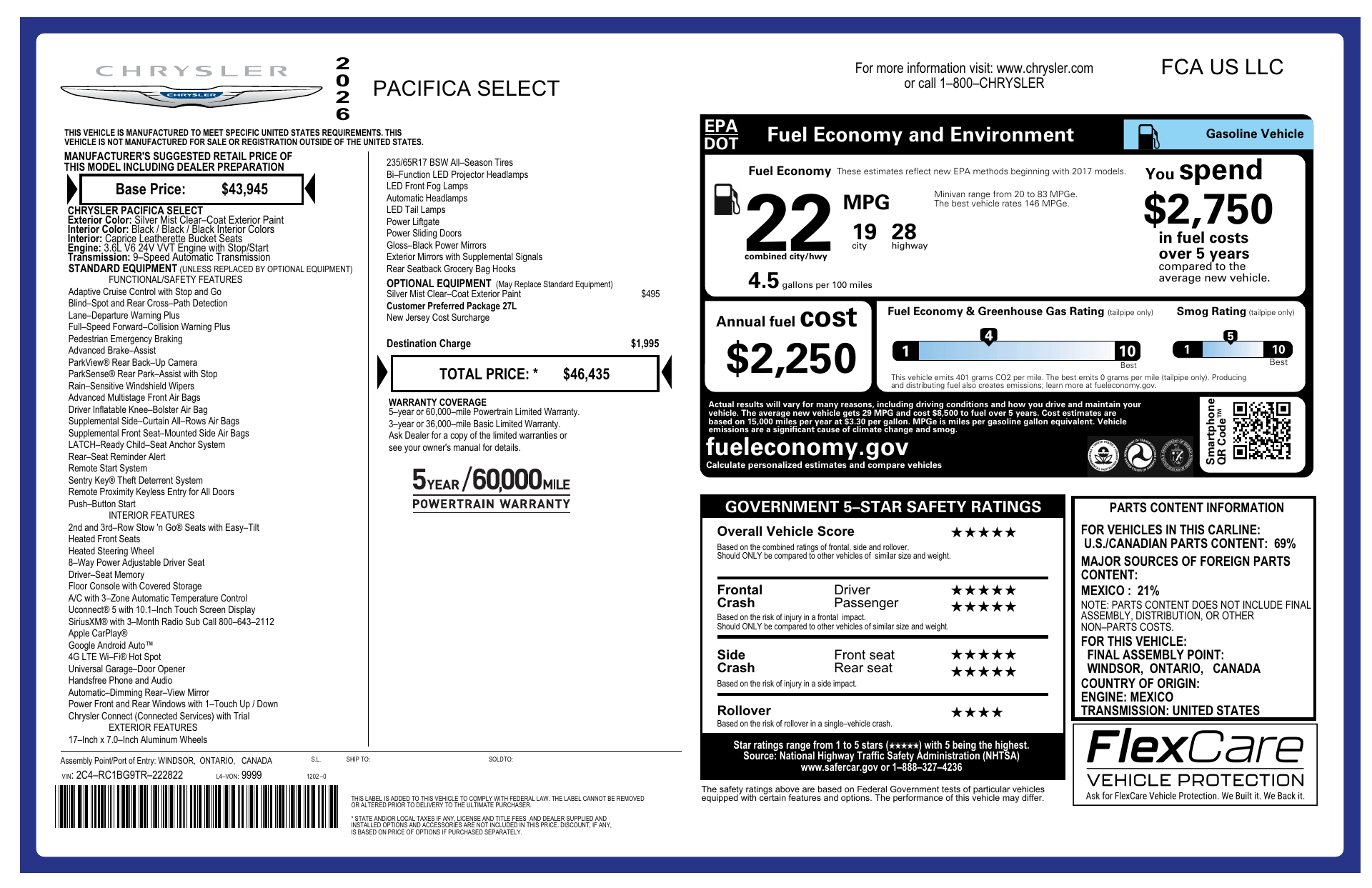 Turn heads in this 2026 Chrysler Pacifica Select finished in sleek Silver with a refined Black interior. Family-ready and versatile, it offers roomy seating, easy-fold cargo space, intuitive Uconnect infotainment with smartphone integration, and advanced safety features for confident driving. Backed by Chrysler’s standard basic, powertrain and rust warranties for added peace of mind—stop by for a test drive today and experience the Pacifica Select for yourself.