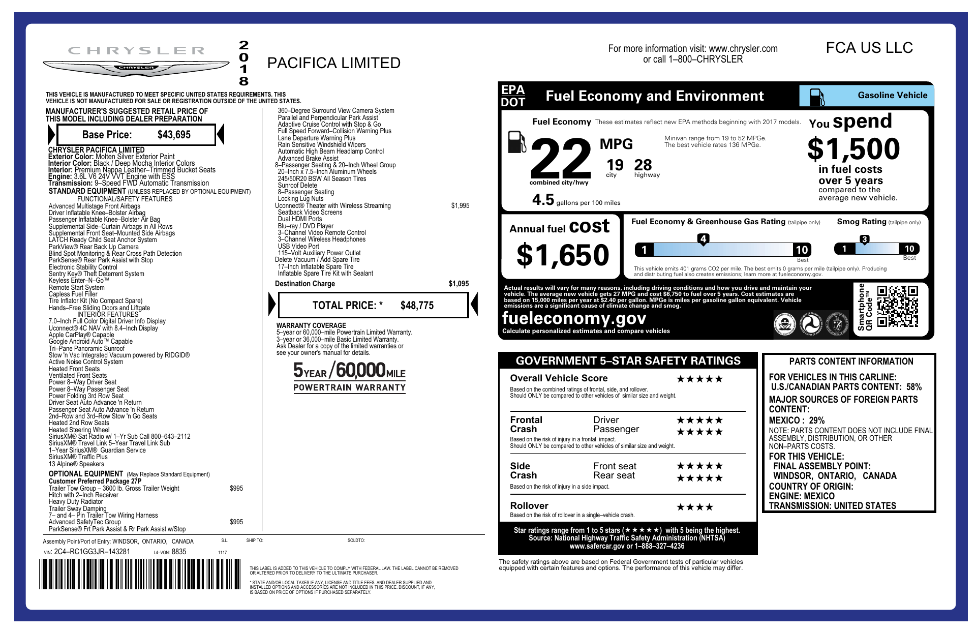 Turn heads in this 2018 Chrysler Pacifica Limited — Silver exterior, Black leather interior — a premium, family-ready minivan that seats seven with real comfort and convenience. Enjoy heated, multi‑adjustable power front seats (with lumbar), passenger power adjustments, keyless start, cruise control and a telescopic steering column for effortless driving. Safety is comprehensive: ABS, traction control, driver/passenger/side and curtain airbags, child safety door locks and a vehicle anti‑theft system. Eye‑catching HID headlights, fog lamps and 18" alloy wheels on 235/60R18 tires complete the package — backed by factory warranties (Basic 36 months/36,000 miles; Powertrain 60 months/60,000 miles; Rust 60 months/100,000 miles). Ready for a test drive? Call today and make it yours.
