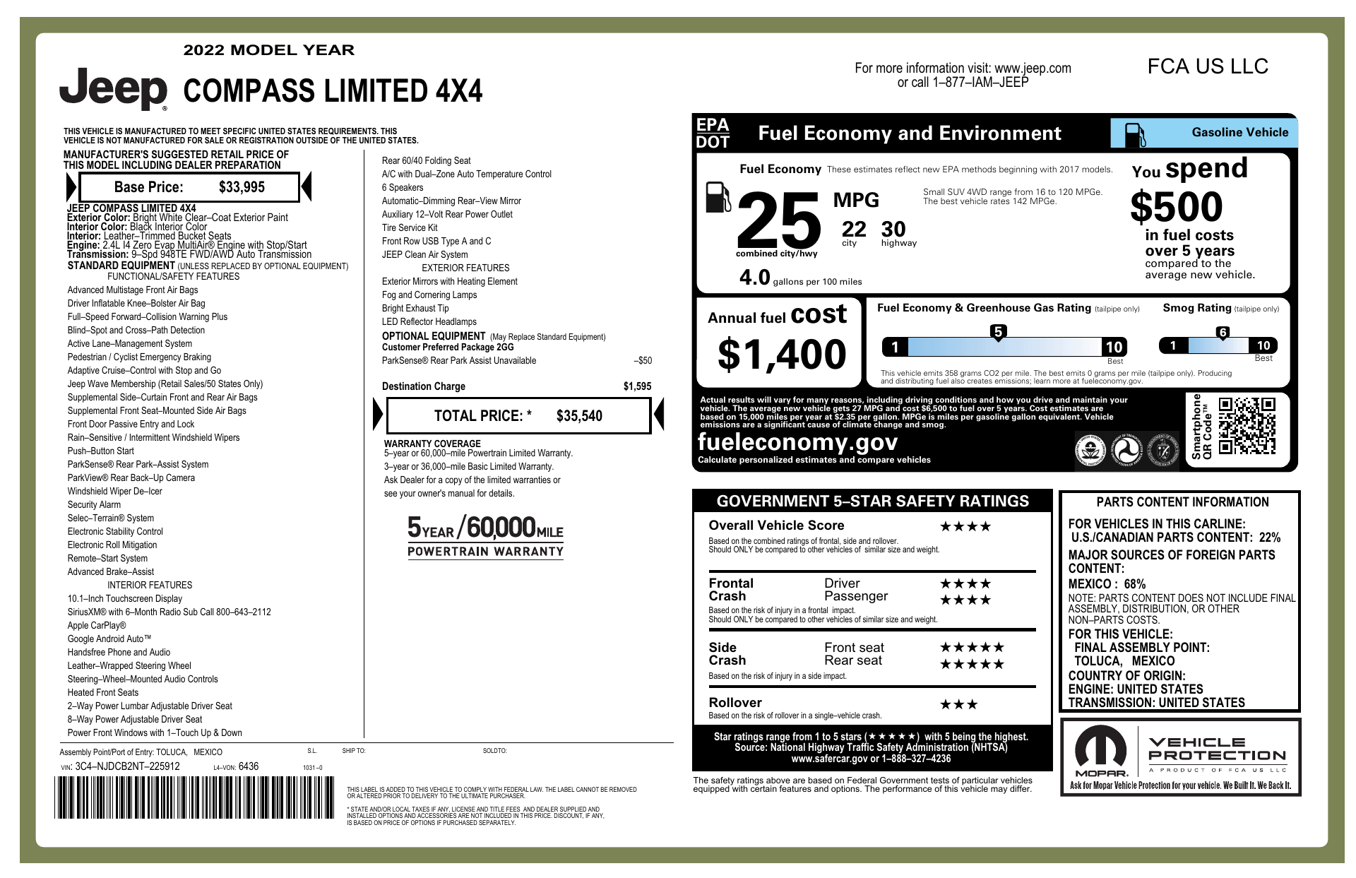 Meet the 2022 Jeep Compass Limited — striking White exterior paired with a sleek Black leather interior. This compact SUV blends confident capability and upscale comfort: Jeep 4WD with ABS, traction and stability control for sure-footed driving, plus a full suite of airbags. Enjoy premium features like heated and ventilated front leather seats with power lumbar and memory, heated leather steering wheel, upgraded navigation, dual-zone climate control, power sunroof, and keyless entry with remote start. Practical touches include rain-sensing wipers, automatic headlights, fog lights, heated mirrors and 18" alloy wheels. Backed by a 3-year/36k basic and 5-year/60k powertrain warranty. Ready for a test drive — call or stop by today and take the Compass for a spin.