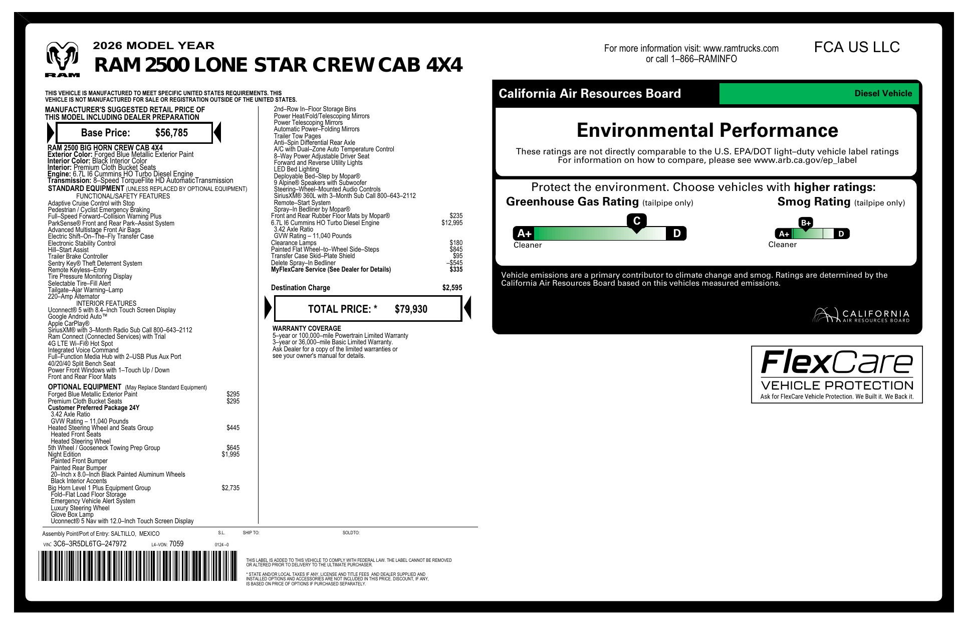 Meet the 2026 RAM 2500 Big Horn in striking Blue with a Black interior — rugged capability and everyday comfort wrapped into one. Standard 4WD, a heavy‑duty chassis with LT275/70R18E tires, and full ABS/traction/vehicle stability control give you confidence on the jobsite or the trail. Enjoy modern convenience with keyless entry, remote start, upgraded navigation, heated mirrors and automatic headlights, plus child‑safety locks and anti‑theft protection for peace of mind. Room for six, a spacious cabin, and an industry‑leading 10‑year/100,000‑mile powertrain warranty make this a smart, powerful choice. Stop by today for a test drive.