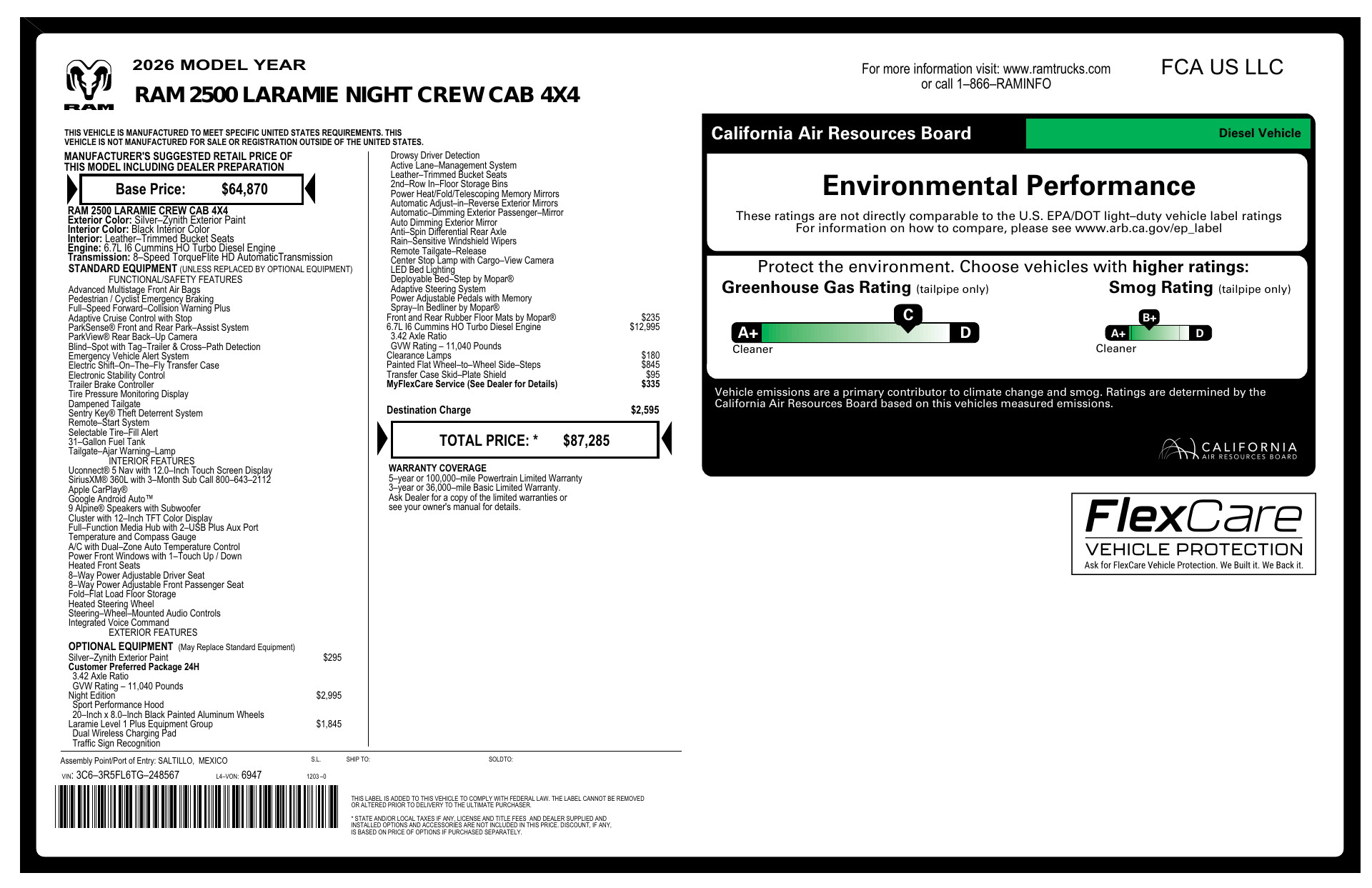 Discover the 2026 RAM 2500 Laramie in striking Silver with a Black leather interior — the perfect blend of luxury and capability. This rig comes loaded with confidence-inspiring features: full-time 4WD, limited-slip differential, ABS with electronic brake assist and stability/traction control for sure-footed handling, plus a full complement of airbags and vehicle anti-theft protection. Inside, enjoy heated leather front seats with multi-adjustable power and lumbar support, a heated leather steering wheel, dual-zone climate controls and convenient keyless entry with remote start/climate control. Add premium touches like AM/FM with subwoofer, automatic headlights, power heated mirrors and a full-size spare — this Laramie is ready for both work and weekend. Stop by or call today to see it in person and take a test drive.