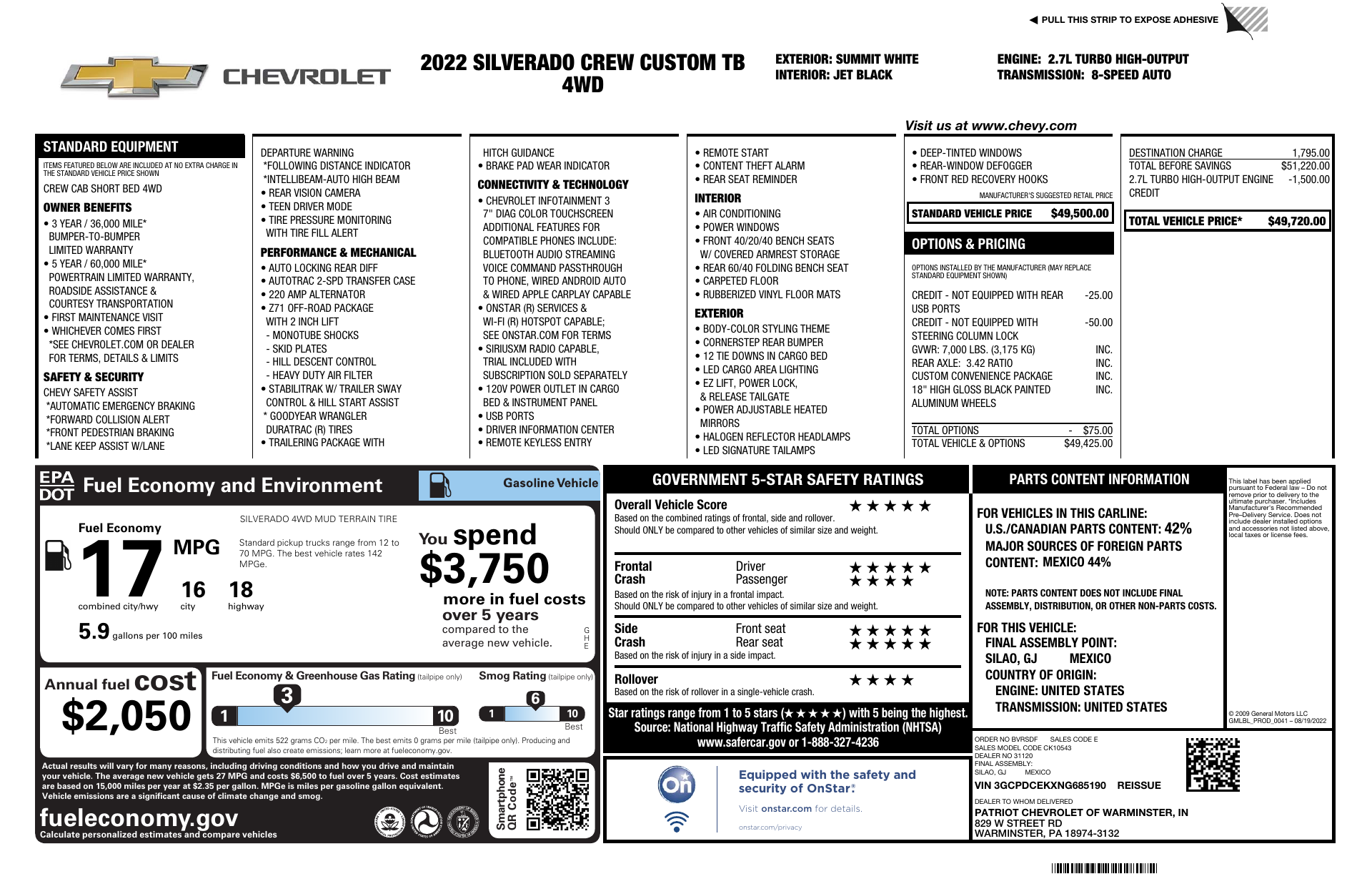 2022 Custom Trail Boss — rugged capability with smart convenience. This Trail Boss is built for the trail and the city: heavy-duty 4WD with locking differential, skid plate protection and LT275/65R18 tires deliver 10.7" of ground clearance and confidence off‑road, while ABS, traction and vehicle stability systems keep you safe on pavement. Inside, enjoy daily comfort and convenience—heated front seats, heated leather steering wheel, dual-zone climate with remote ignition, keyless entry and a sliding rear window—plus robust anti-theft locks and a full‑size spare. Backed by a 36/36k basic and 60/60k powertrain warranty (72 months rust), it’s ready to work the moment you are. Call or stop by today for a test drive.