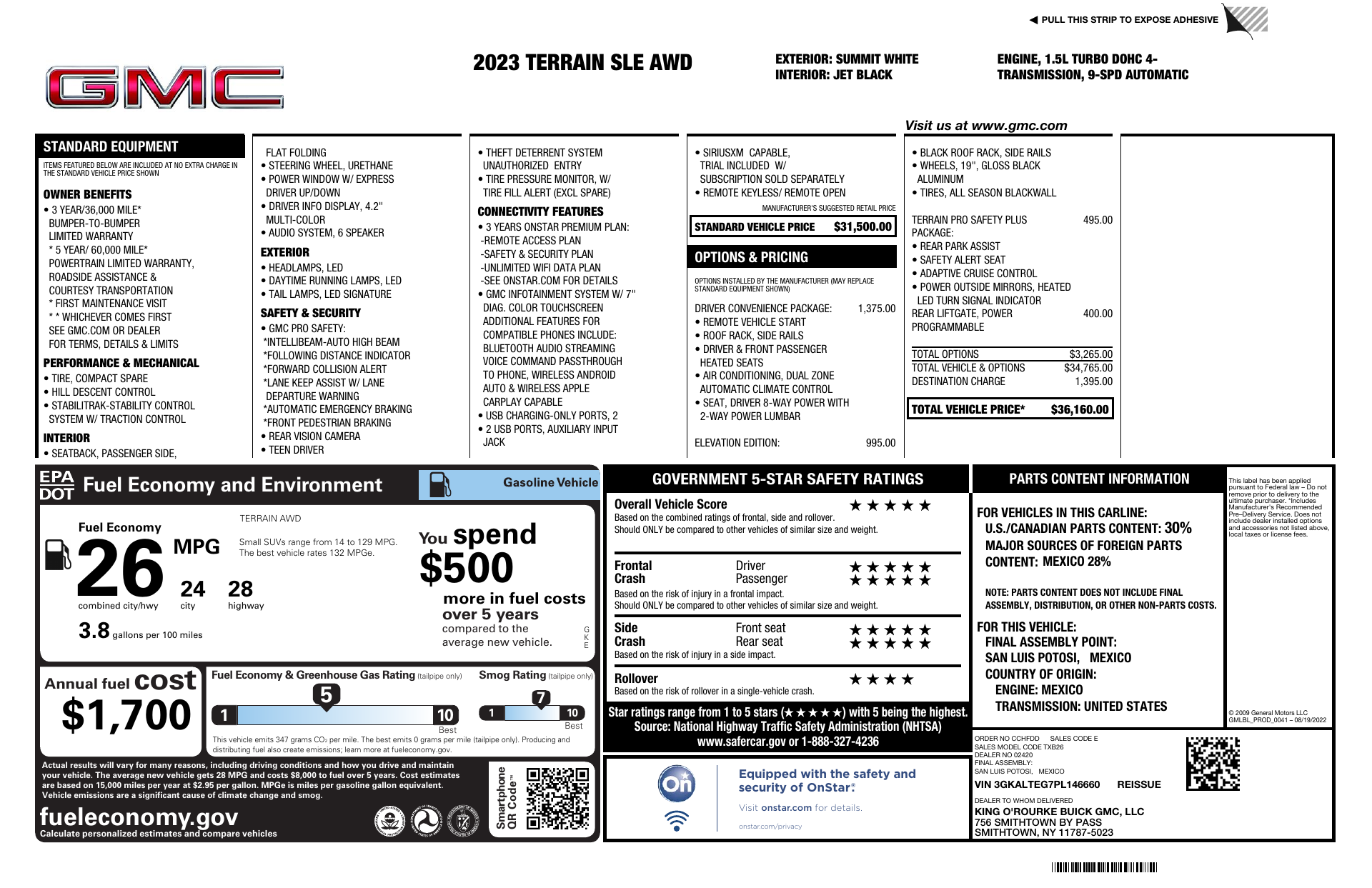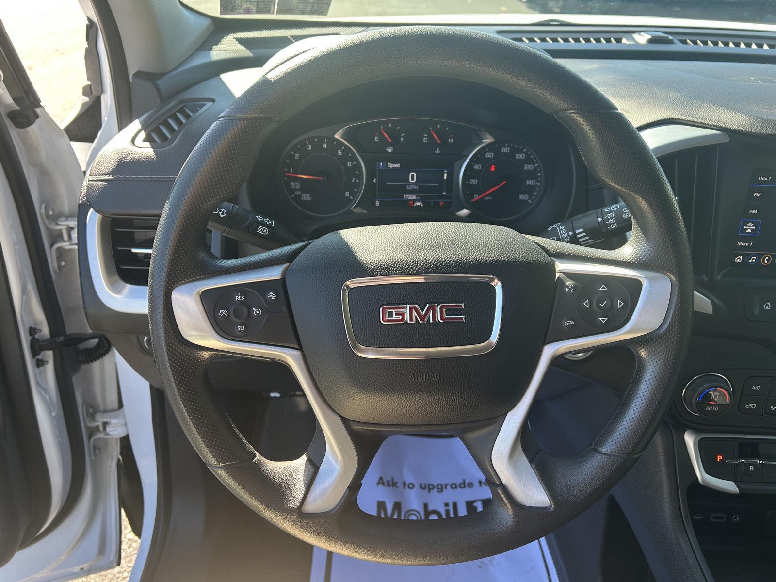 Introducing the 2023 GMC Terrain SLE — finished in crisp White with a richly appointed Black leather interior. This compact SUV pairs confident AWD capability and advanced safety (ABS, stability & traction control, multiple airbags and anti-theft protection) with everyday comfort: heated front seats, heated leather steering wheel, dual-zone climate, driver power seat and adjustable pedals. Enjoy modern conveniences like keyless entry, remote start with climate control, automatic headlights, a subwoofer for improved audio, and a full-size spare — all backed by GMC’s warranties (36/36 basic, 60/60 powertrain, 72/100 rust). Ready for work, weekend or family duty — stop by today and take it for a test drive.