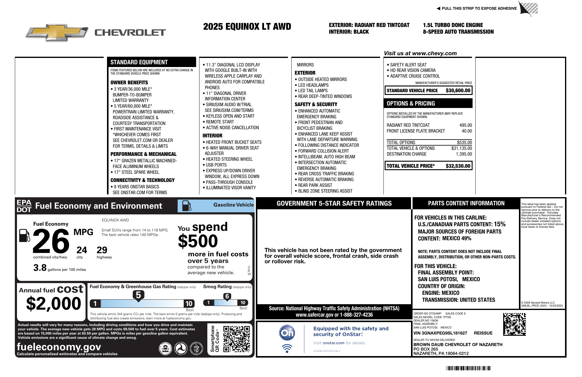 Step into the 2025 Chevrolet Equinox LT in striking Red with a Black interior — a compact SUV that blends bold style with everyday practicality. Enjoy an upgraded power sunroof, heated front seats and heated steering wheel, dual-zone climate controls, navigation and a user-friendly infotainment system, plus convenient keyless entry and remote start. Drive with confidence thanks to ABS, traction and stability control, a full complement of airbags, child-safety door locks and vehicle anti‑theft protection. On the road it rides on alloy wheels with 235/65R17 tires and independent suspension for a composed, comfortable ride — roomy seating for five and Chevy’s standard warranty coverage round out the package. Stop by for a test drive and see why the Equinox LT is the smart, stylish choice.