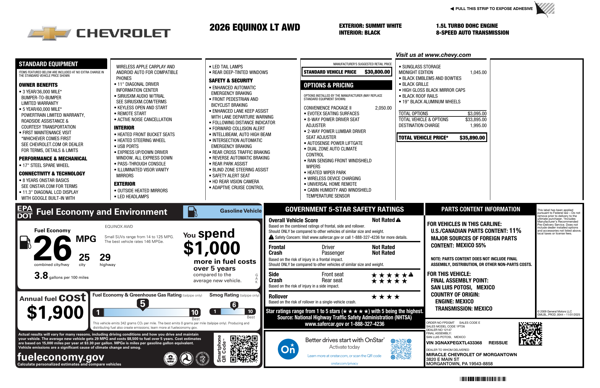 Turn heads in the crisp White 2026 Chevrolet Equinox LT with a sleek Black interior — a compact SUV that blends confident style with smart capability. Standard AWD, traction and stability control, ABS and a full airbag suite deliver peace of mind, while run‑flat tires and a limited‑slip differential keep you sure‑footed in changing conditions. Inside you’ll enjoy heated front seats, a heated steering wheel, navigation, keyless entry with remote start/climate control, and an upgraded power sunroof for open‑air days. Backed by Chevy’s warranties (36/36K basic, 60/60K powertrain, 72/100K rust), it’s a practical, well‑equipped ride—schedule your test drive today and feel the difference.