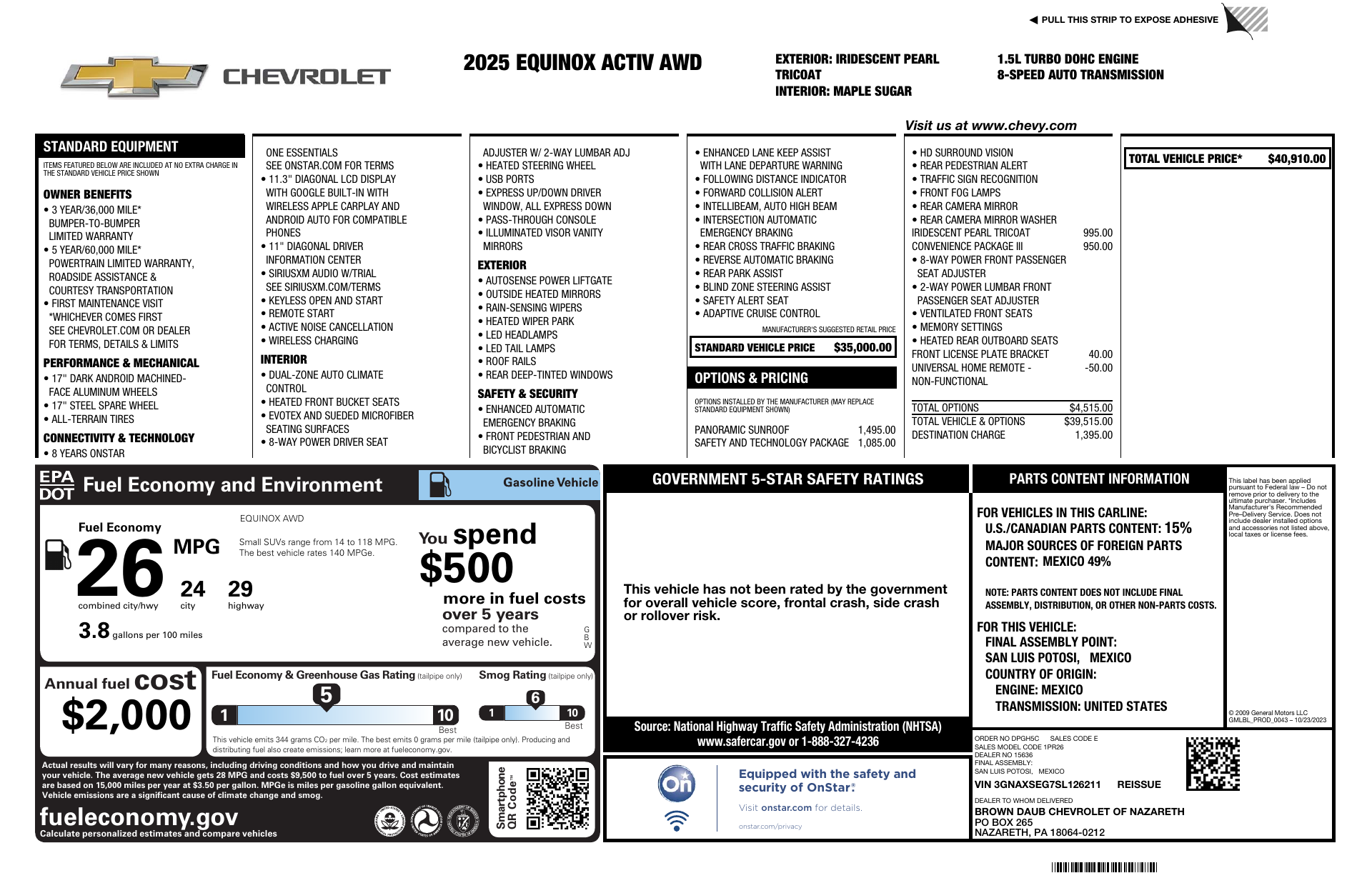 Bold, capable and refined — meet the 2025 Chevrolet Equinox Activ in White. This compact SUV comes ready for anything with standard AWD, ABS, traction and stability control plus a limited‑slip differential for confident all‑weather handling. Inside, enjoy year‑round comfort with heated steering wheel, heated and cooled front seats, driver power seat with lumbar support and dual‑zone climate that can be started remotely for the perfect cabin on arrival. Tech and convenience are front and center with navigation, keyless entry, remote ignition, power sunroof and alloy wheels for a crisp, sporty look. Safety is comprehensive — full airbags, child safety locks and vehicle anti‑theft systems — and you’re backed by Chevy’s warranties: 3 years/36,000 miles basic, 5 years/60,000 miles powertrain and 6 years/100,000 miles rust. Ready to take it for a test drive? I’ll get the keys ready.
