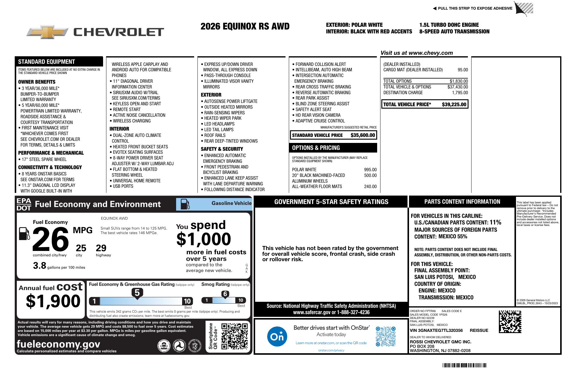 Meet the 2026 Chevrolet Equinox RS in striking White with a sleek Black interior — sporty RS styling with room for five and confident 19-inch wheels wrapped in 235/55R19 run-flat tires. Enjoy everyday comfort and convenience with heated front seats and heated steering wheel, driver multi-adjustable power seat with lumbar, keyless entry and remote start with climate control, plus automatic headlights and cruise control. Drive with peace of mind thanks to a full complement of airbags, ABS, traction and stability control — all backed by Chevrolet’s 3‑year/36,000‑mile basic and 5‑year/60,000‑mile powertrain warranties. Stop by today and take it for a test drive.