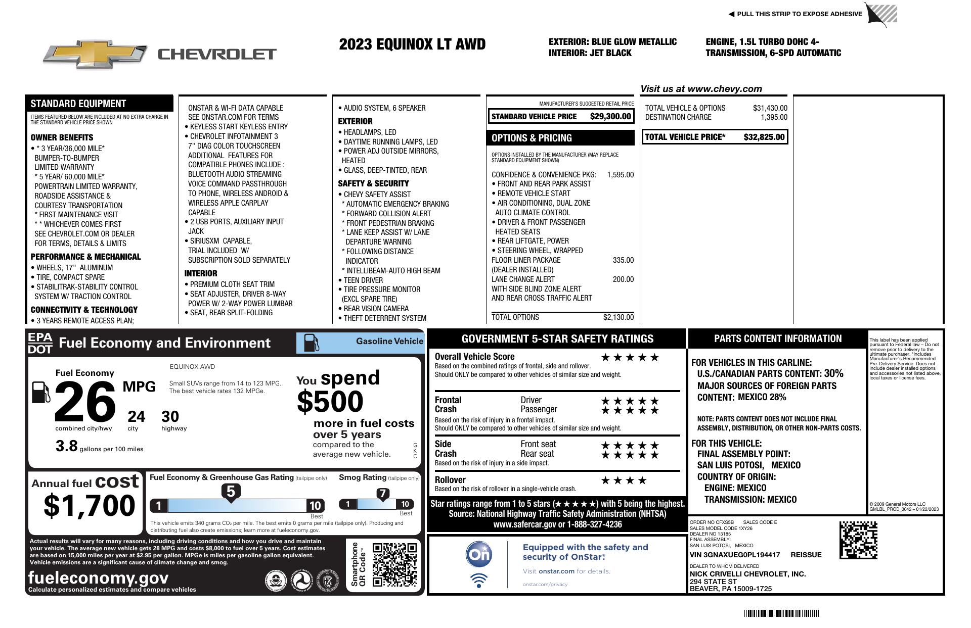 Turn heads in the 2023 Chevrolet Equinox LT—striking Blue exterior with a refined Black leather interior. This compact SUV pairs confident AWD capability and full stability/traction controls with comprehensive safety (multiple airbags, child locks and vehicle anti-theft) for everyday peace of mind. Enjoy comfort and convenience with heated front seats, a heated leather-wrapped steering wheel, dual-zone climate control, power-adjustable seats and keyless entry with remote start/climate control—plus a premium AM/FM system with subwoofer for your drive. Backed by Chevy’s warranties and seating for five, it’s a stylish, well-equipped package—come test-drive one today.