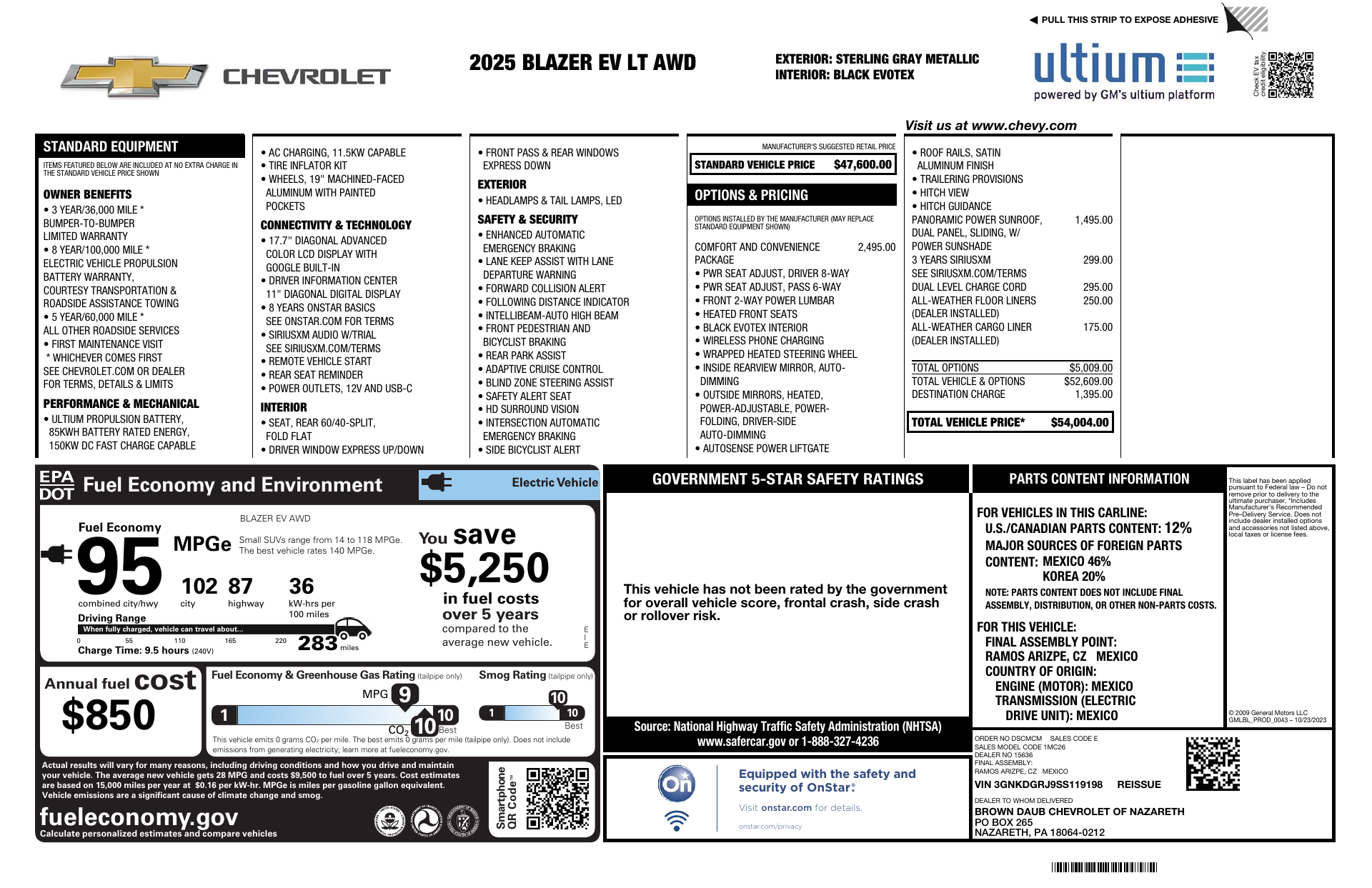 Turn heads in the 2025 Chevrolet Blazer EV LT — striking Gray exterior with a refined Black interior. This all‑electric SUV pairs confident AWD traction with advanced safety (multiple airbags, ABS, traction and stability control) and theft protection, while creature comforts like heated front seats, heated steering wheel, dual-zone climate, power sunroof and built‑in navigation keep every drive effortless. Enjoy convenience features such as keyless entry, remote start with climate control, automatic headlights and alloy 19‑inch wheels, plus roomy seating for five. Backed by Chevrolet’s 36‑month/36,000‑mile basic warranty and a 72‑month/100,000‑mile rust warranty — stop by for a test drive and experience it for yourself.