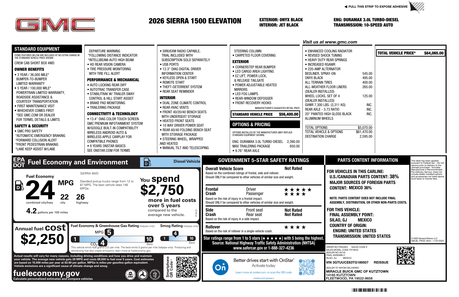 Turn heads in the 2026 GMC Sierra 1500 Elevation — finished in sleek Black inside and out, this true 4x4 blends rugged capability with premium comfort. Locking differential, full 4WD, ABS and stability/traction control give you confidence on any road, while 275/60R20 tires and a full‑size spare mean you’re always ready to roll. Inside, enjoy a heated power driver’s seat, heated leather‑wrapped steering wheel, power sunroof, navigation and keyless entry with remote start/climate control. Advanced airbags and electronic parking aid round out a package that’s as safe as it is stylish — come experience it for yourself.
