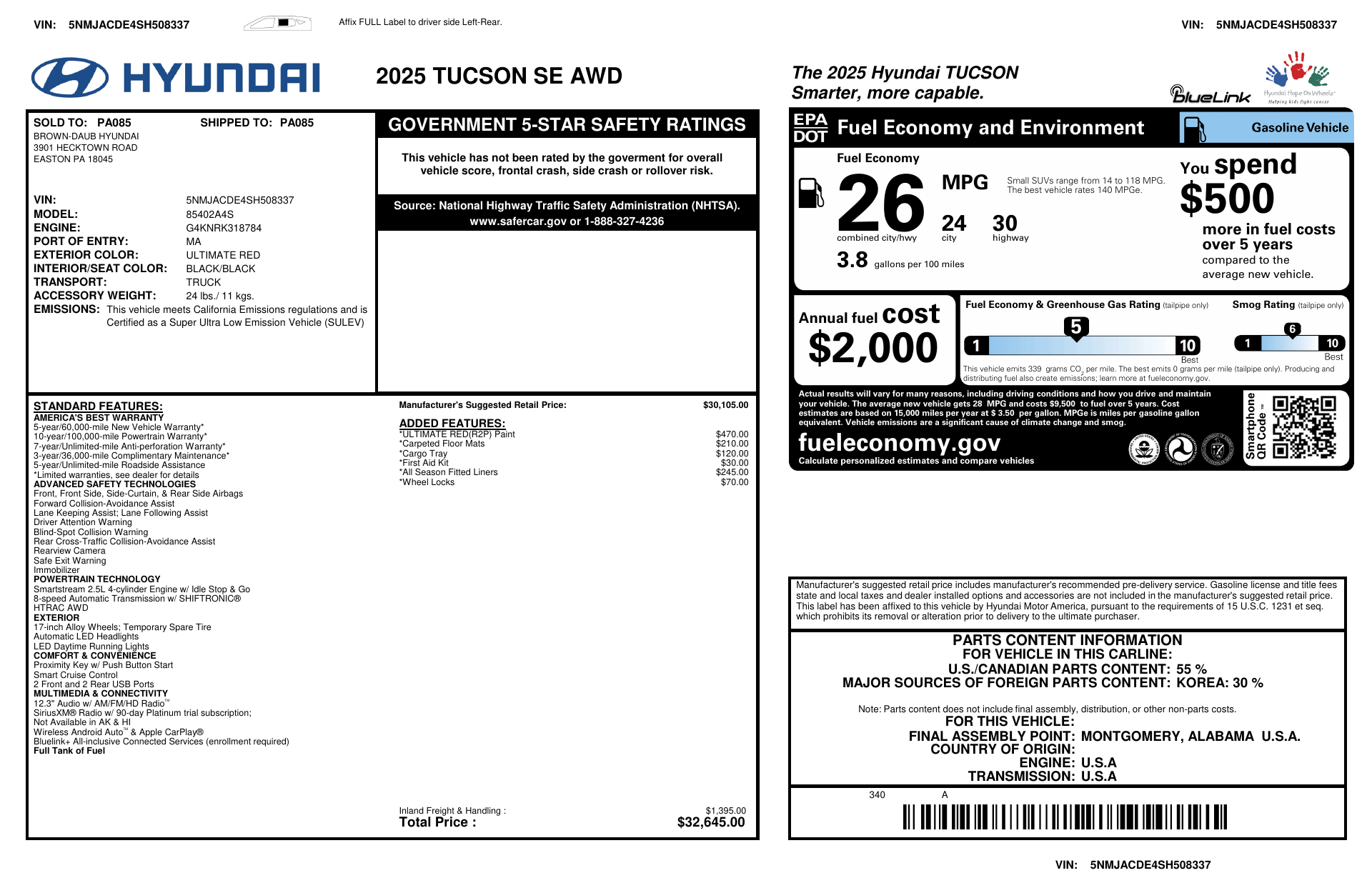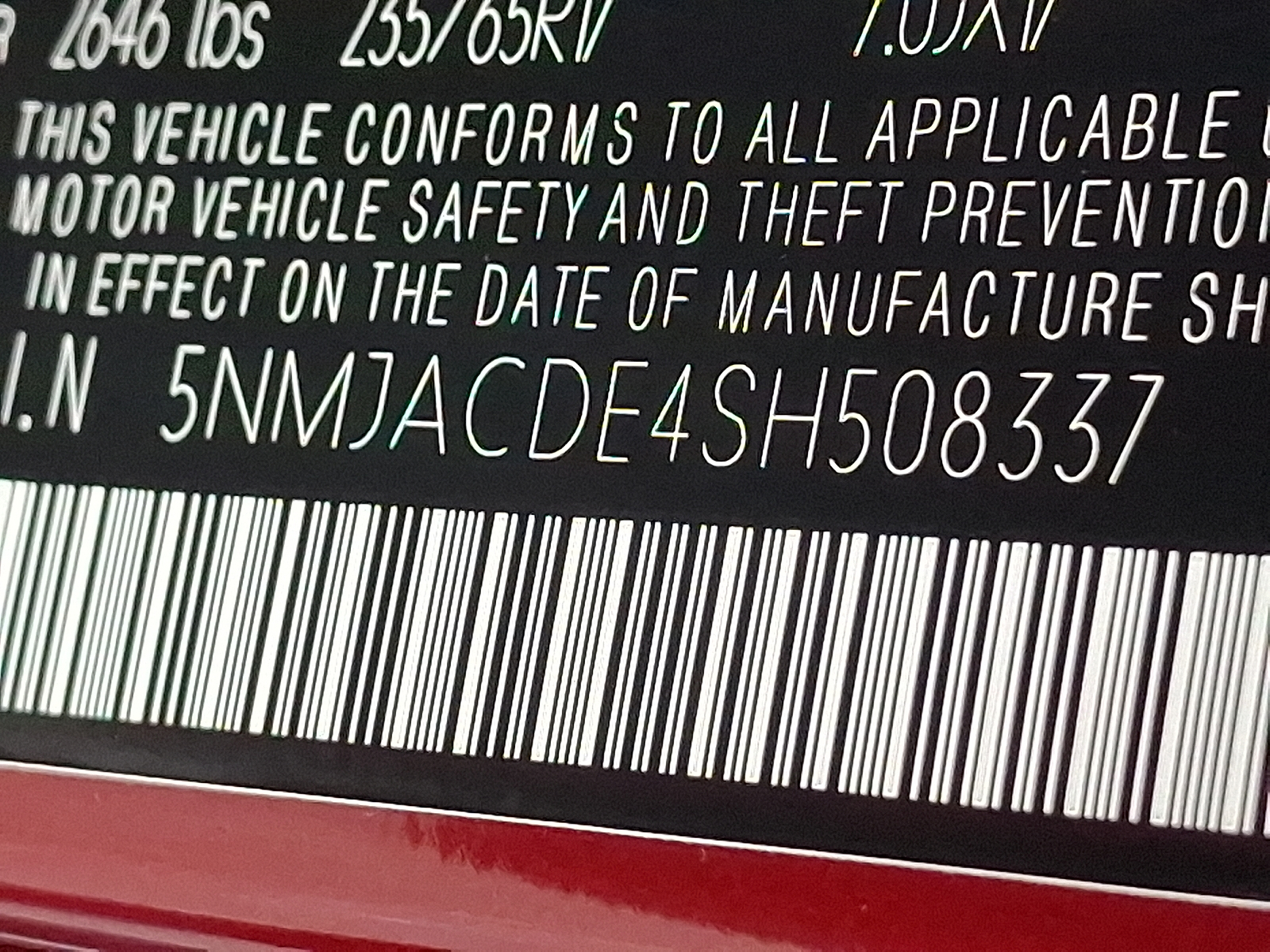 VIN: 5NMJACDE4SH508337