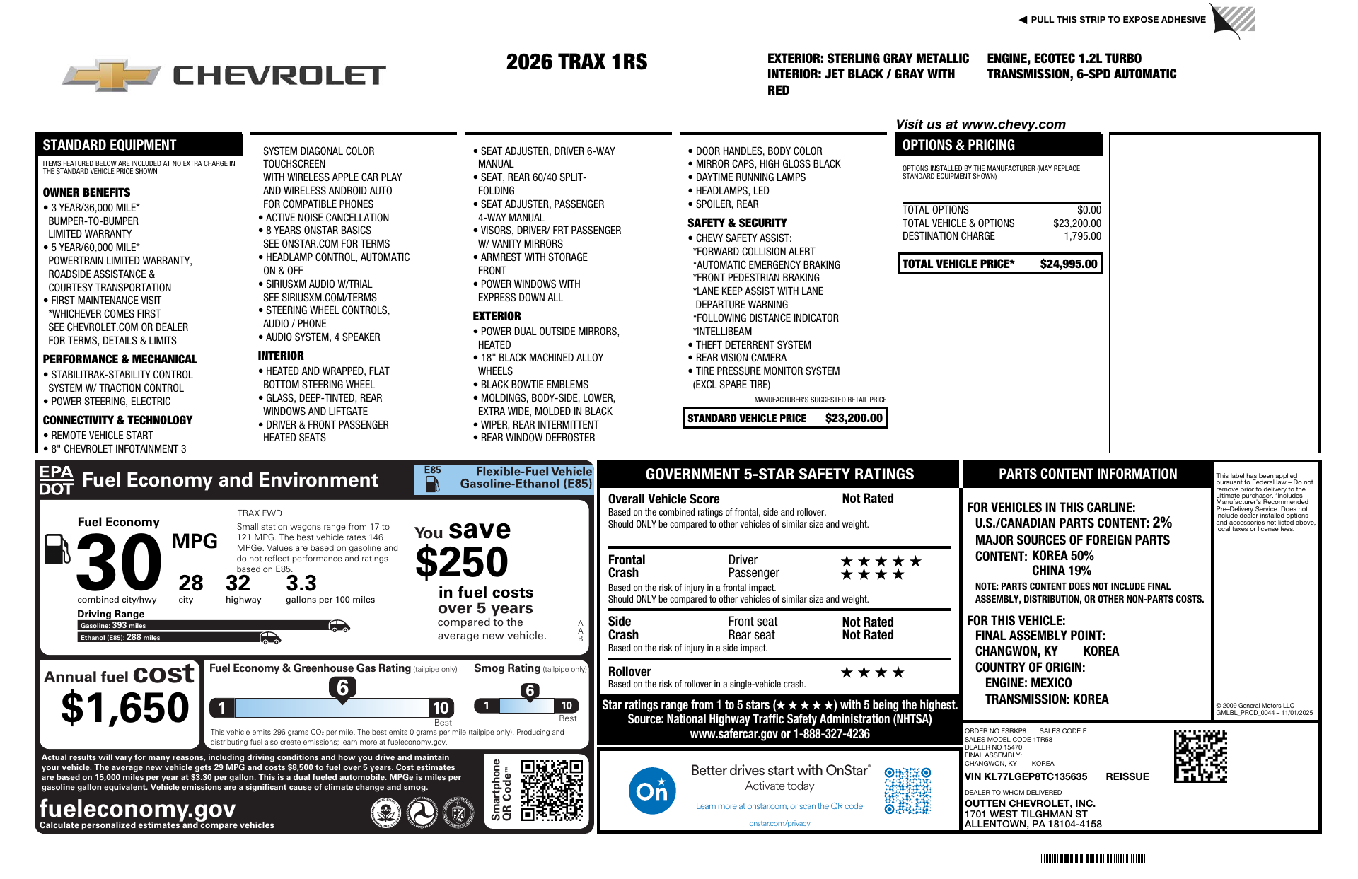 Meet the 2026 Chevrolet Trax FWD 1RS in sleek Gray on Gray — a compact SUV that blends sporty style with everyday practicality. The 1RS trim brings athletic cues and 18-inch 225/55R18 tires for confident handling, while a lightweight 3,014 lb curb weight and 7.3" ground clearance make it nimble around town and ready for weekend escapes. Inside, thoughtful packaging delivers roomy dimensions for a compact — generous front and rear headroom and legroom plus five-passenger seating — backed by independent front and rear suspension for a comfortable ride. Standard safety features include ABS, driver and passenger airbags, and a well-specified chassis with disc brakes all around for reliable stopping power. Add class-leading warranties (3/36 basic, 5/60 powertrain, 6/100 rust) and you’ve got a confident, low-stress choice in the compact SUV segment. Stop by today and take the Trax 1RS for a test drive.